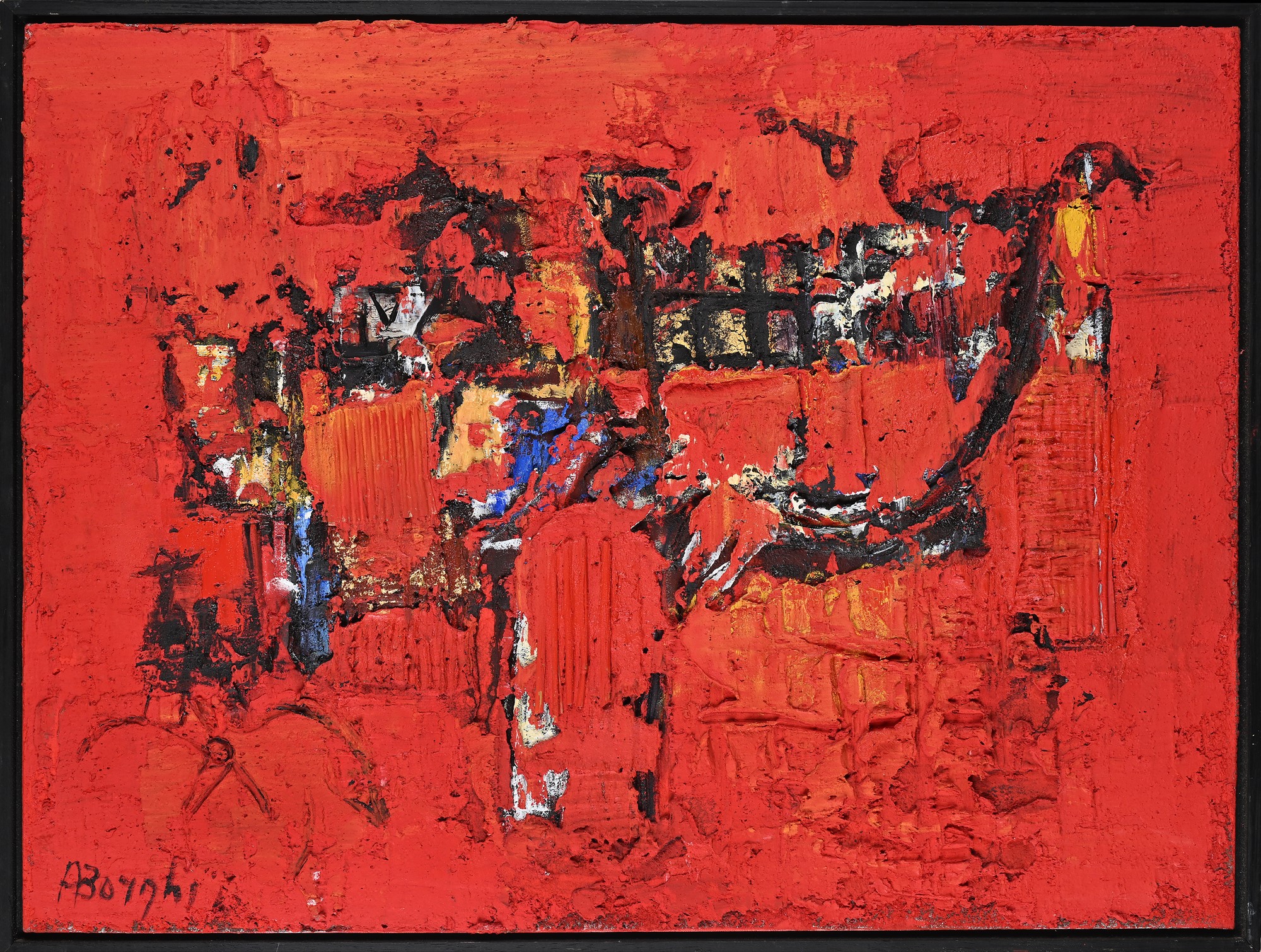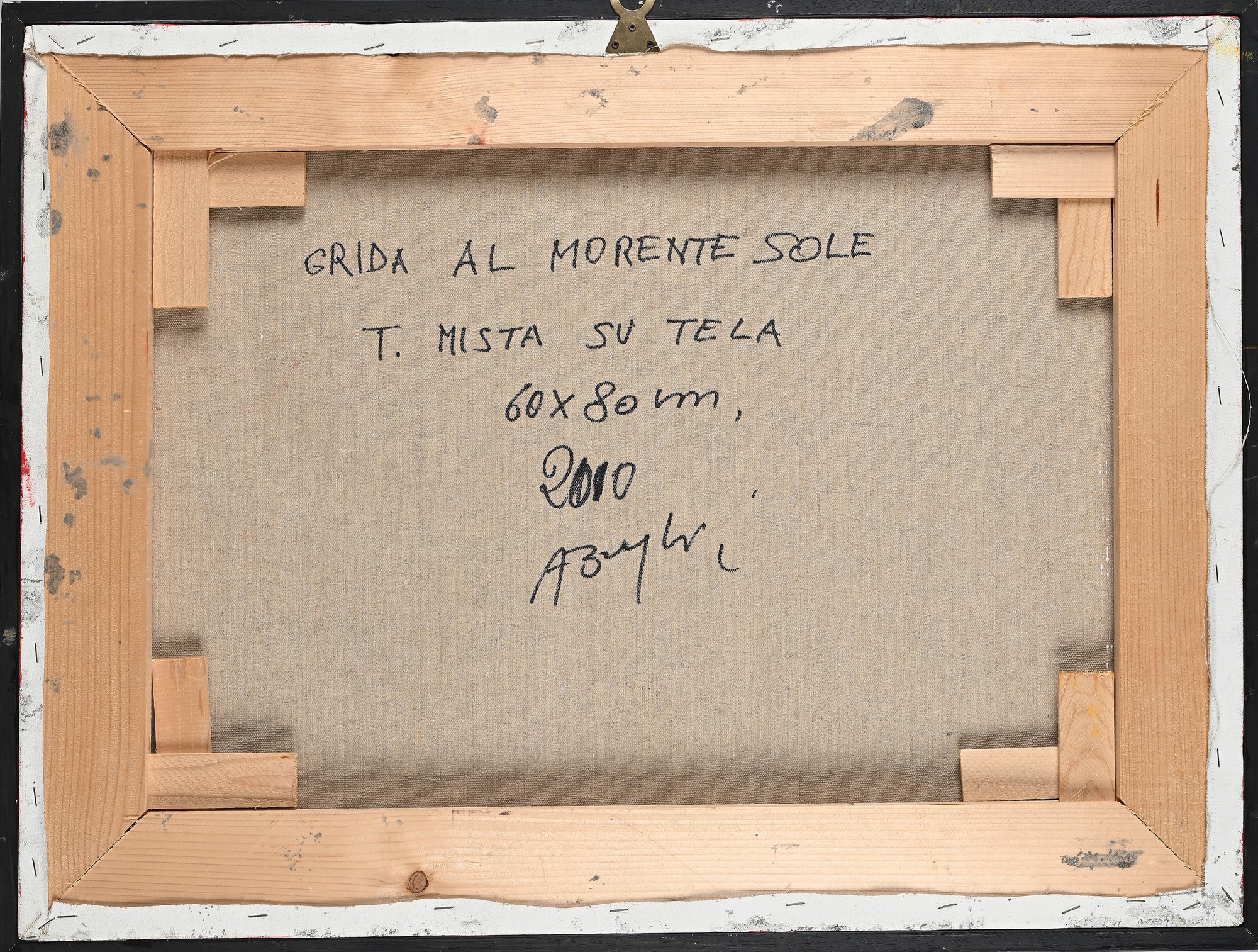 Grida al morente sole 2010 Olio e collage su tela cm 60x80 - in cornice cm 63x83 Firma in basso a sinistra "A.Borghi". Al verso reca titolo, data e firma Certificato di autenticità su fotografia rilasciato e firmato di pugno dall'artista