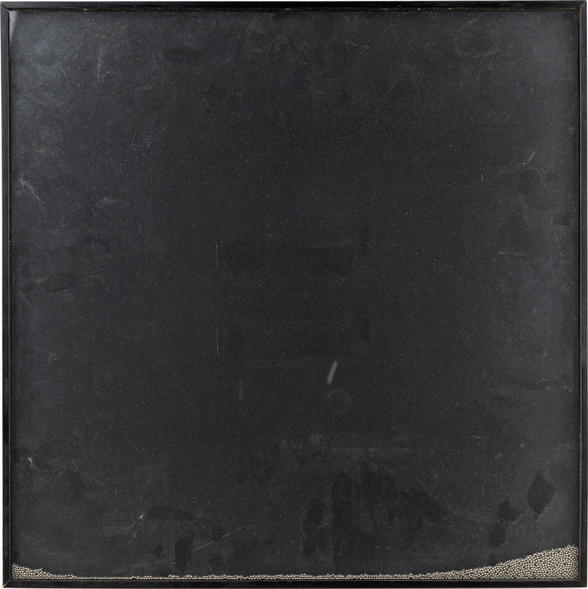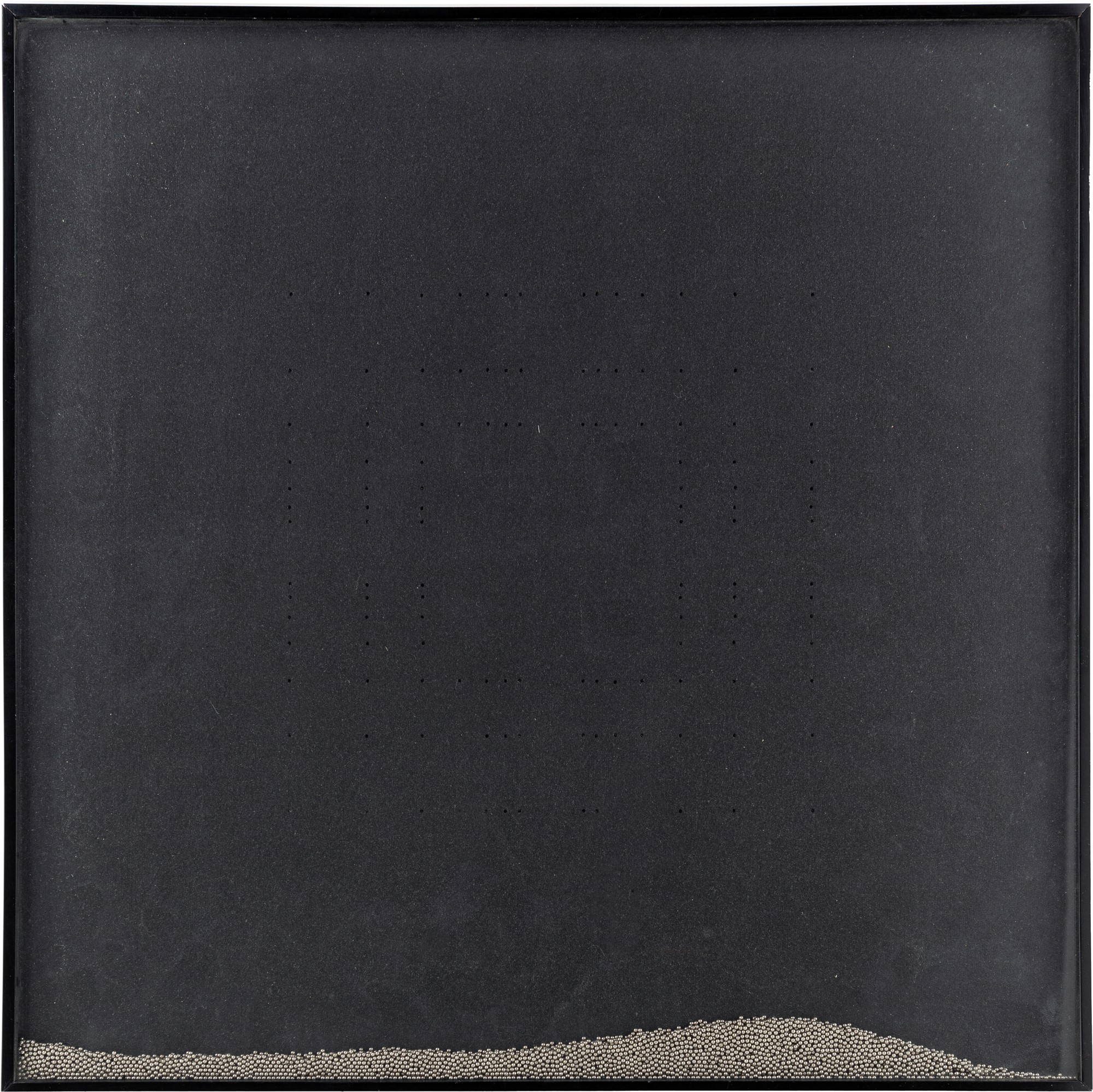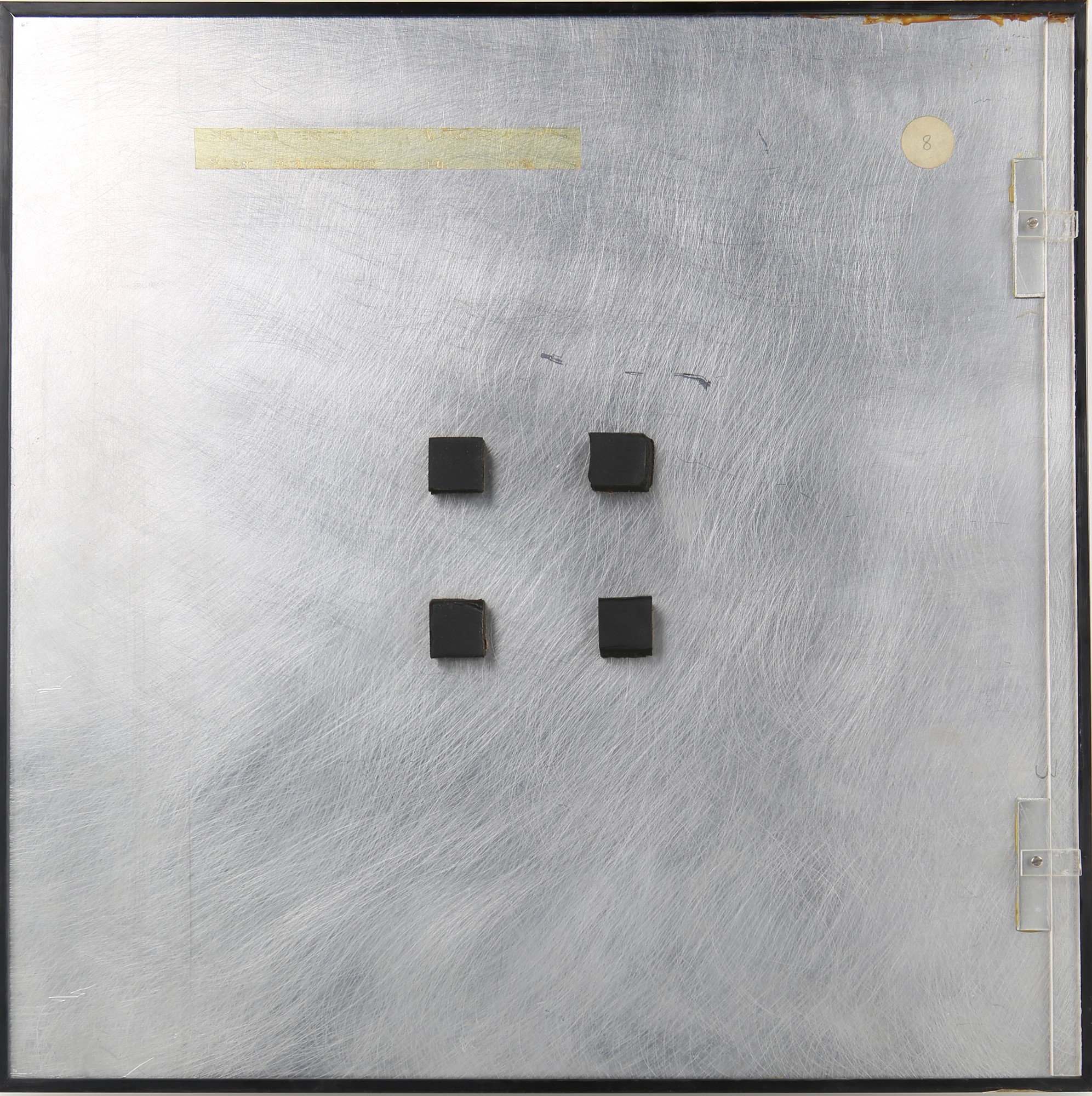 Flusso autovincolante strutturato 1979 Tecnica mista (piccole sfere di metallo, cartone forato dipinto di nero, acciaio) due elementi cm 40x40 l'uno Al verso reca titolo, anno e firma incise
