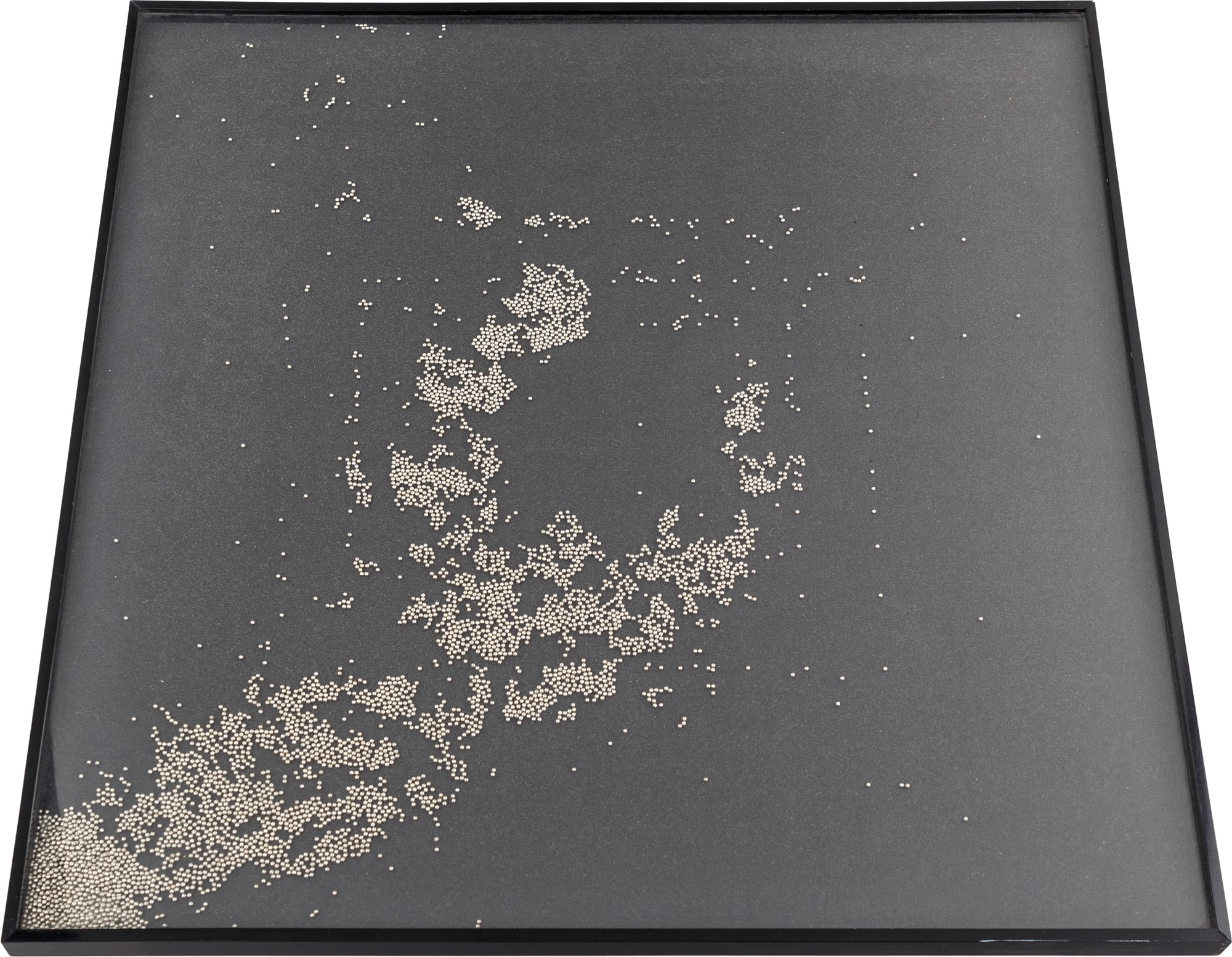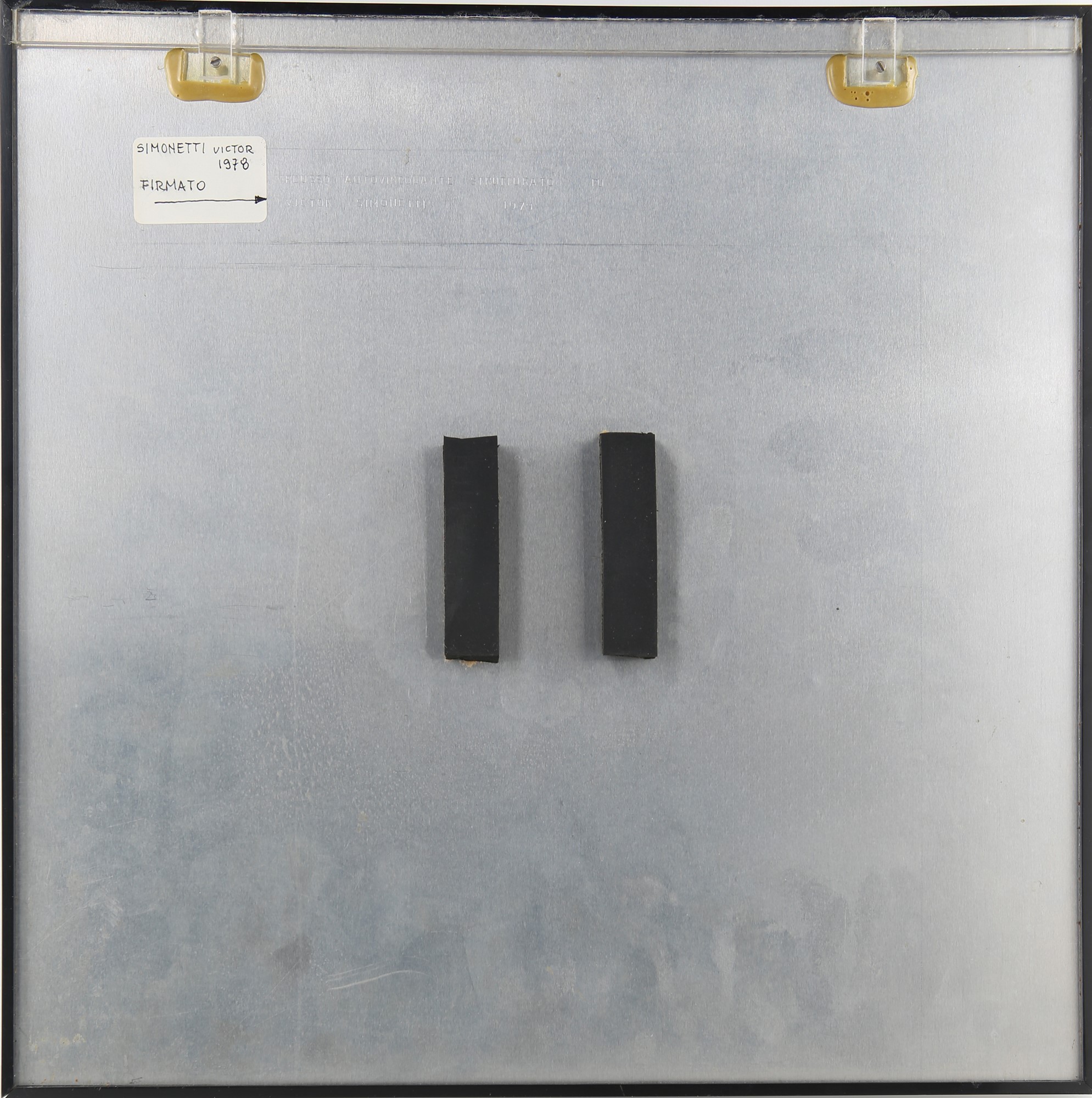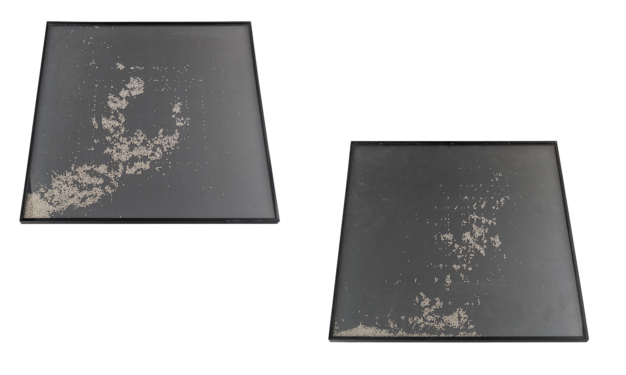 Flusso autovincolante strutturato 1979 Tecnica mista (piccole sfere di metallo, cartone forato dipinto di nero, acciaio) due elementi cm 40x40 l'uno Al verso reca titolo, anno e firma incise