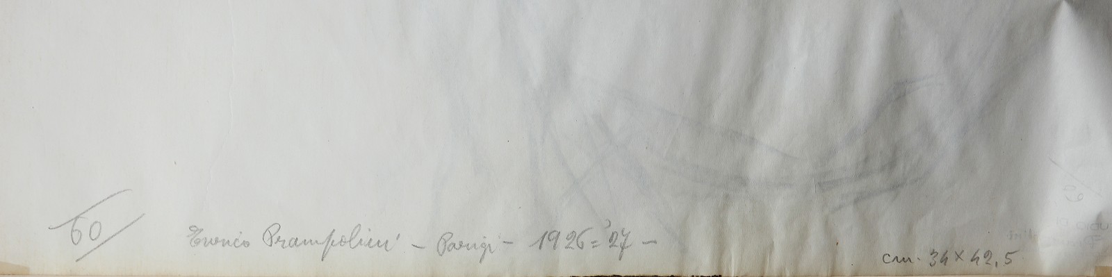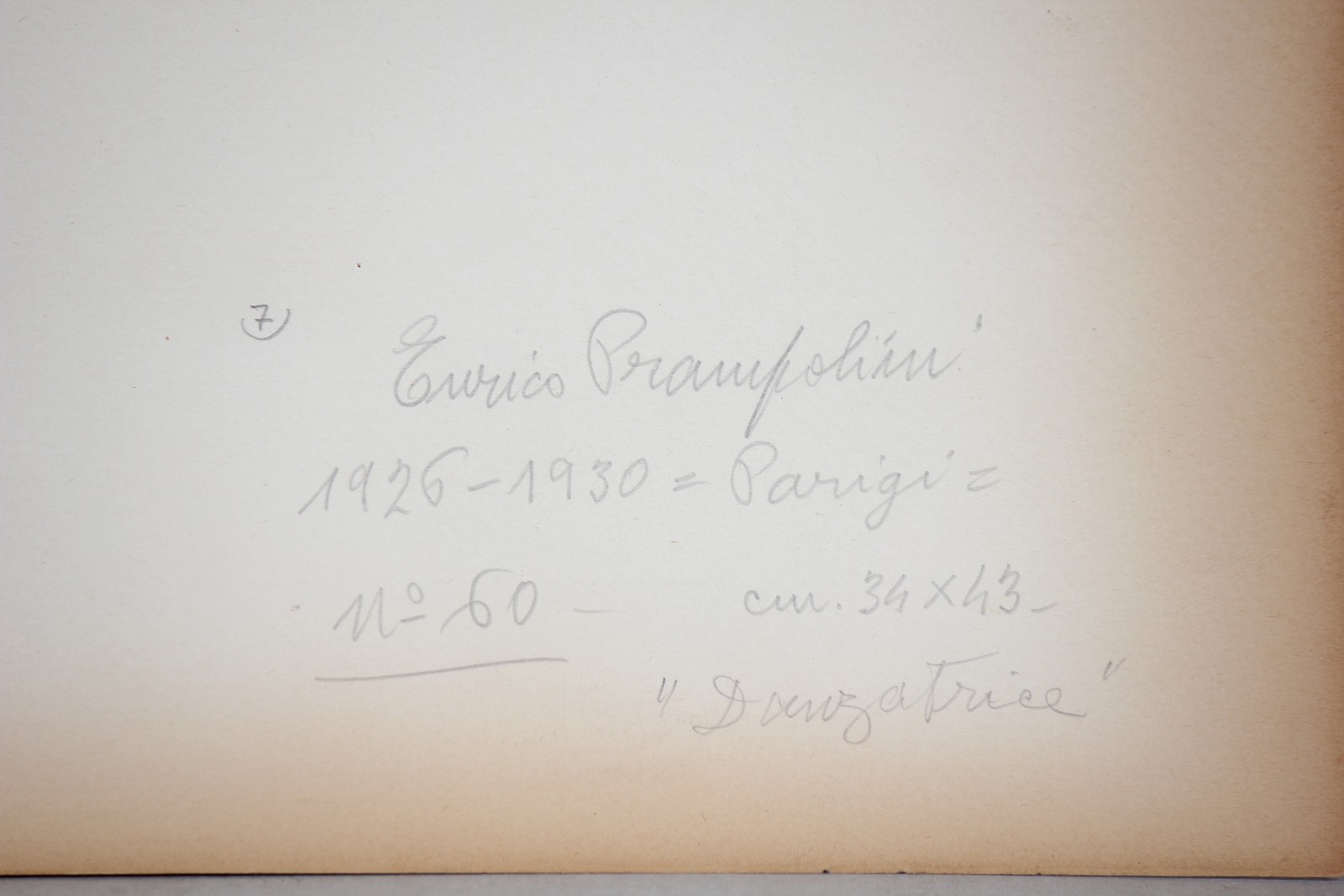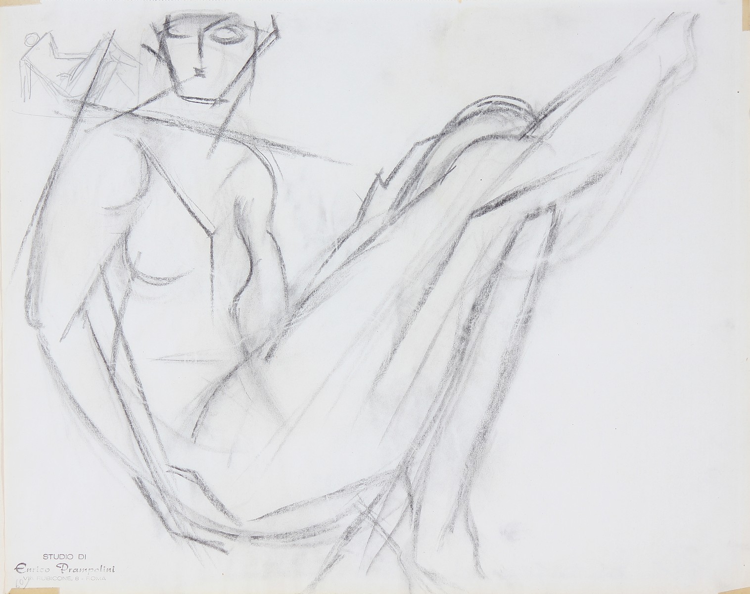 PRAMPOLINI ENRICO (1894 - 1956) Danzatrice. Carboncino su carta. Cm 42,50 x 34,00. Timbro dello studio Prampolini in basso a sinistra. Al retro firma, data (1926/27 Parigi) e misure. Sul cartone protettivo reca il timbro della Galleria Arte Centro, Milano, esposizione dal 16 novembre al 15 dicembre 1970. Autentica su fotografia di Massimo Prampolini.