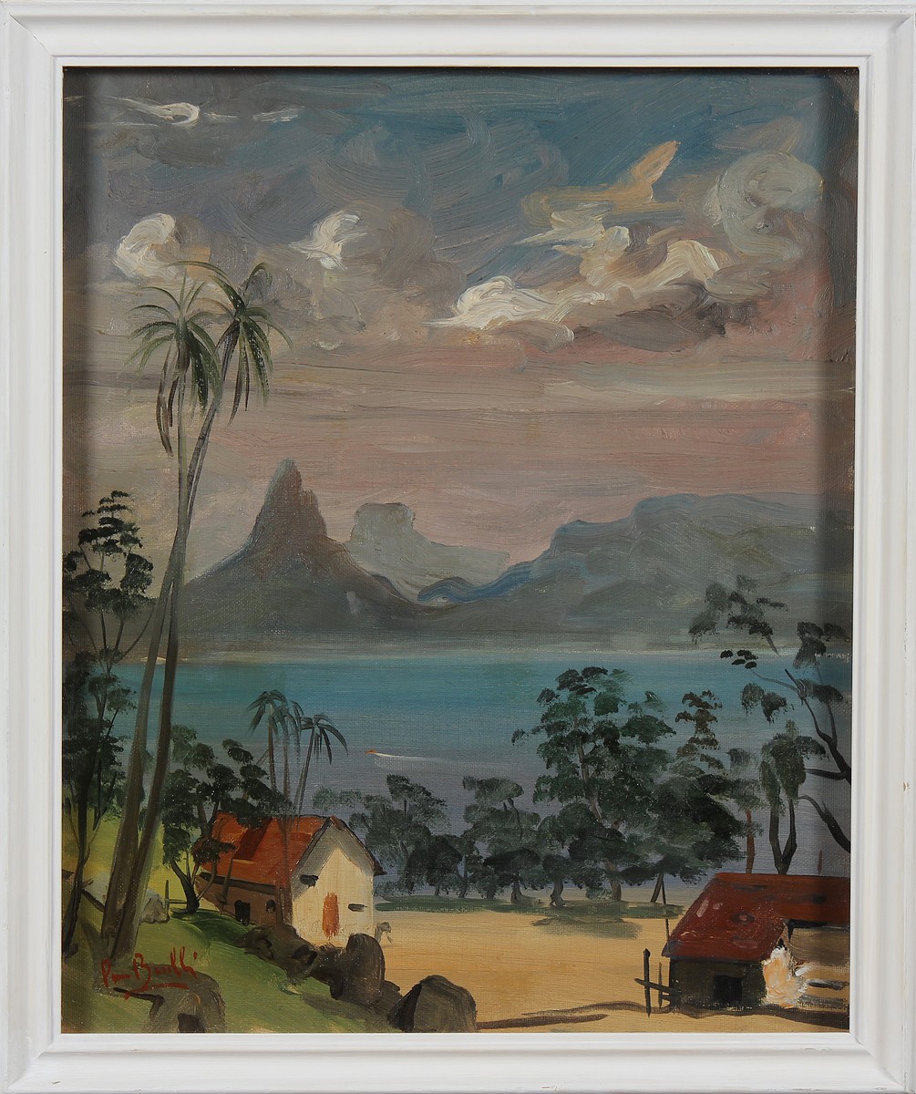 BUELLI PINO (n. 1910) La Lagoa Rio. 1949. Olio su tela . Cm 38,00 x 46,00. Firma in basso a sinistra. Al retro firma, data e titolo. Cornice presente