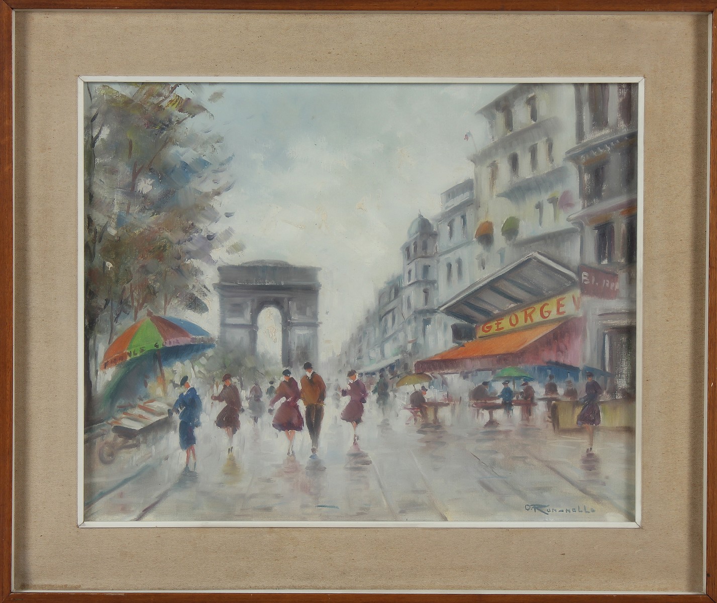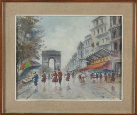 ROMANELLO ONIELO (n. 1926) Paris, les champs- Elysées. Olio su tela . Cm 50,00 x 40,00. Firmato in basso a destra. Al retro cartiglio descrittivo. Cornice presente