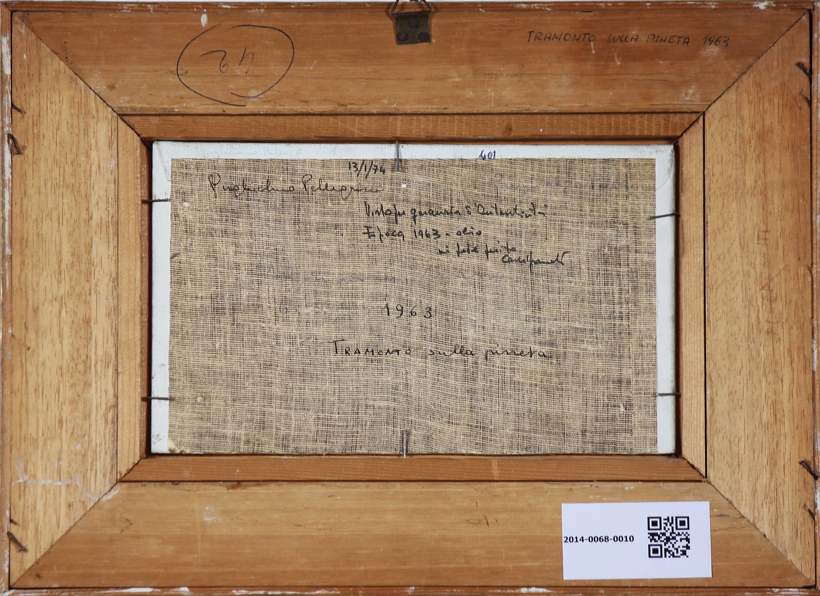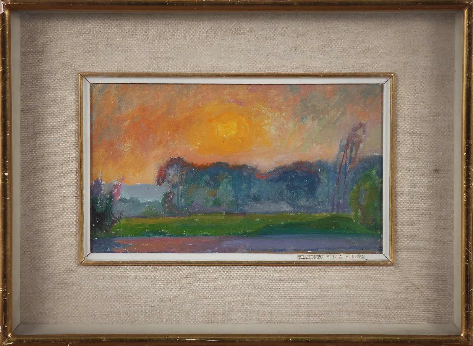 PELLEGRINI GUGLIELMO (1901 - 1963) Tramonto sulla pineta. 1963. Olio su tela cartonata. Cm 24,50 x 15,00. Al retro data e titolo. Pubblicato nel catalogo di Gugliemo Pellegrini a cura di Emilio Radius, edito da Istituto d'arti grafiche Bergamo, 1966, pag 77. Cornice presente