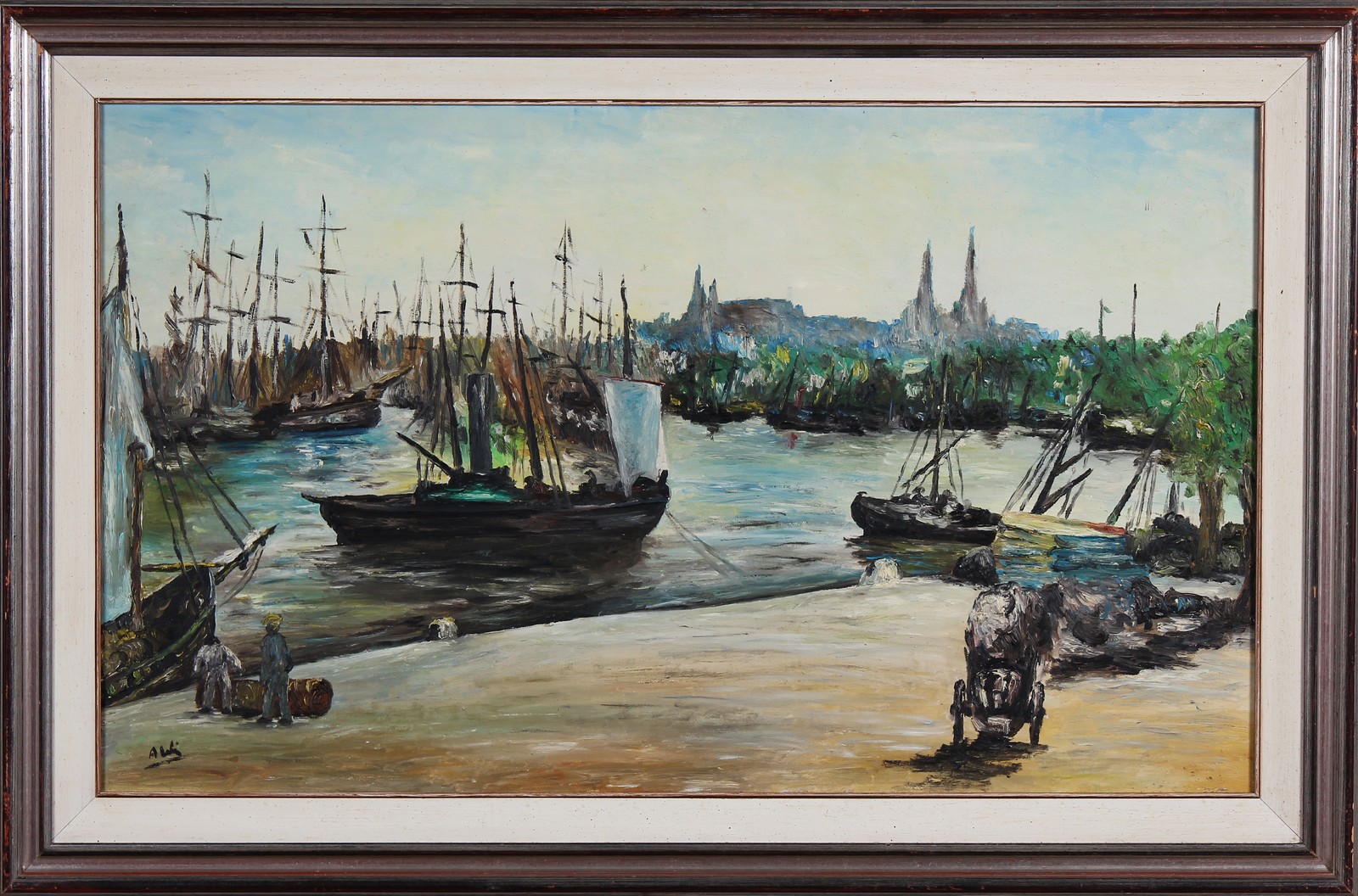 ANONIMO Porto con barche. Olio su tela . Cm 97,00 x 61,00. Firmato in basso a sinistra. Cornice presente