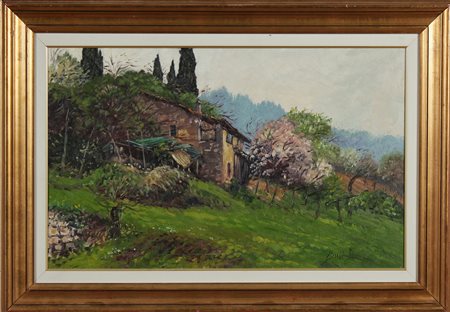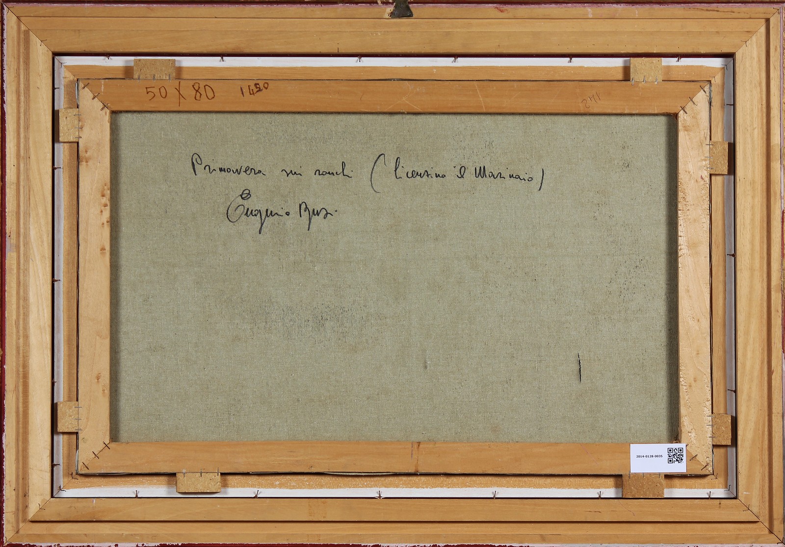 BUSI EUGENIO (n. 1951) Primavera sui Ronchi. Olio su tela . Cm 80,00 x 50,00. Firma in basso a destra. Al retro firma e titolo. La tela presenta un taglio in basso a sinistra. Cornice presente