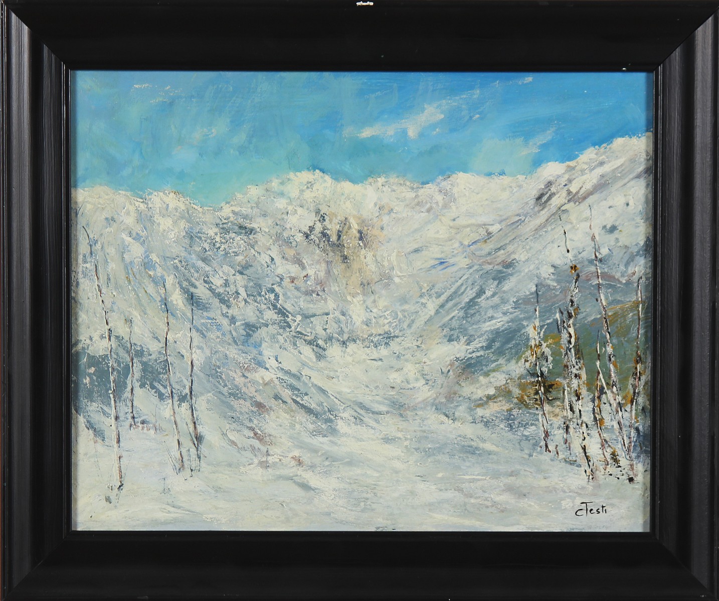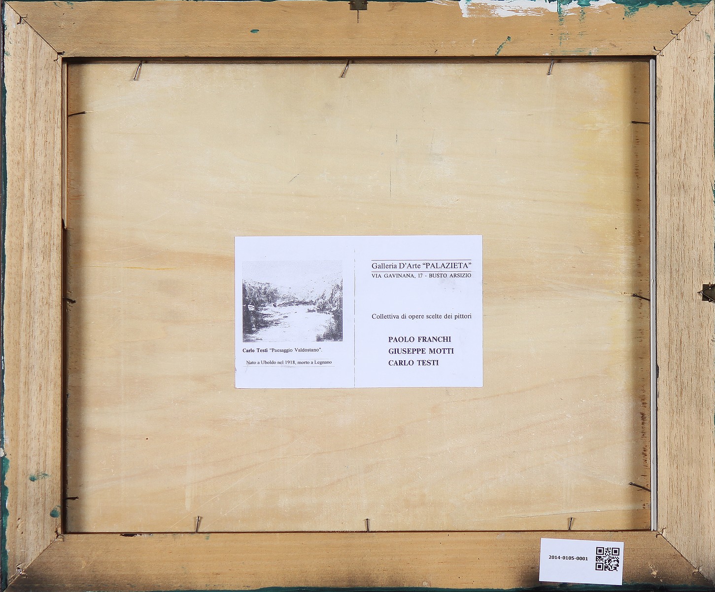 TESTI CARLO (n. 1918) Paesaggio innevato. Olio su tavola. Cm 50,00 x 40,00. Firmato in basso a destra. Al retro cartiglio della Galleria Palazieta di Busto Arsizio. Cornice presente