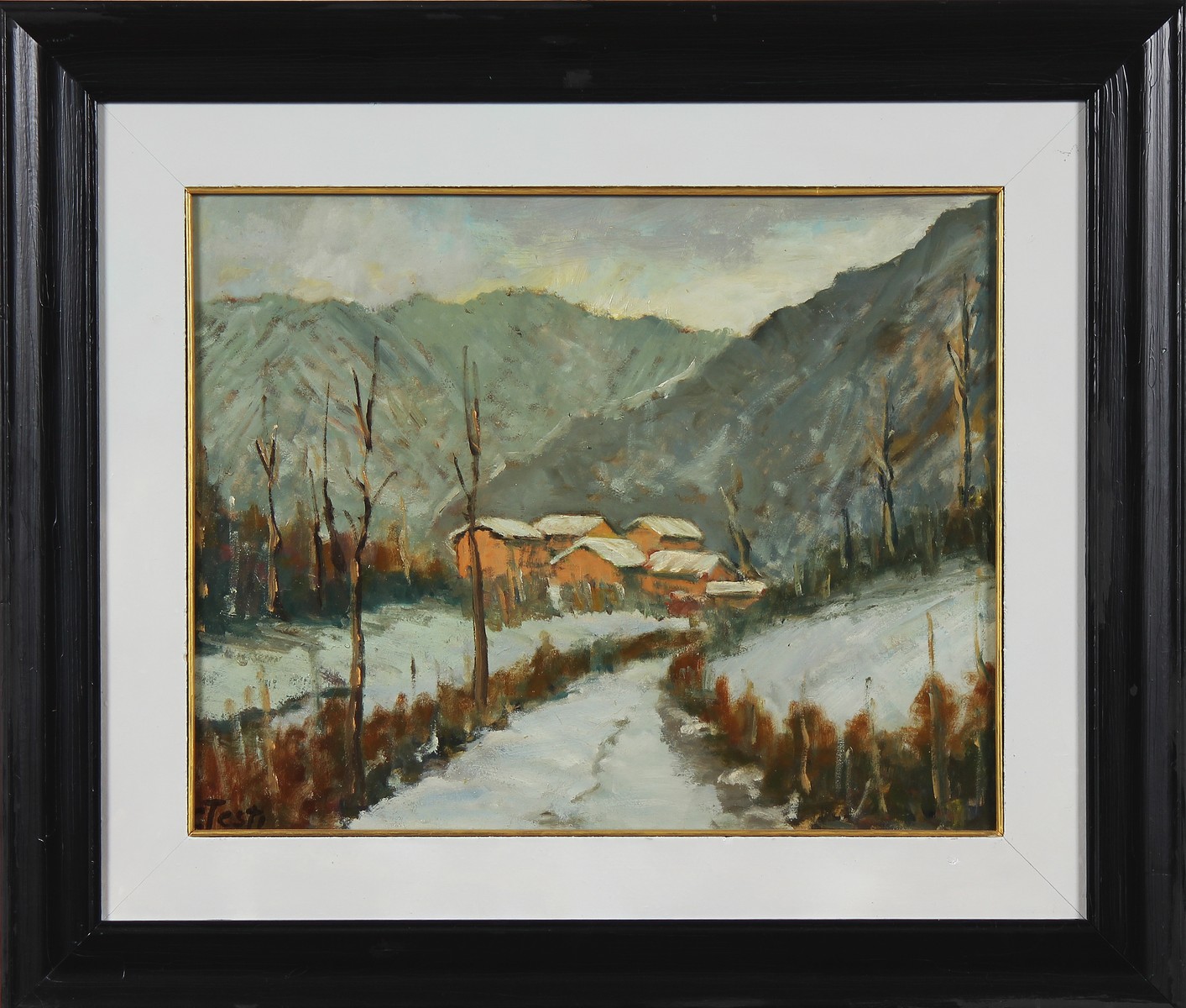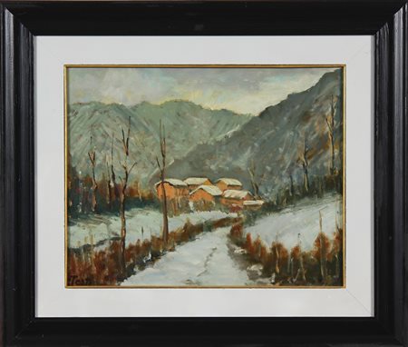 TESTI CARLO (n. 1918) Paesaggio innevato con case. Olio su masonite. Cm 50,00 x 40,00. Firmato in basso a sinistra. Cornice presente