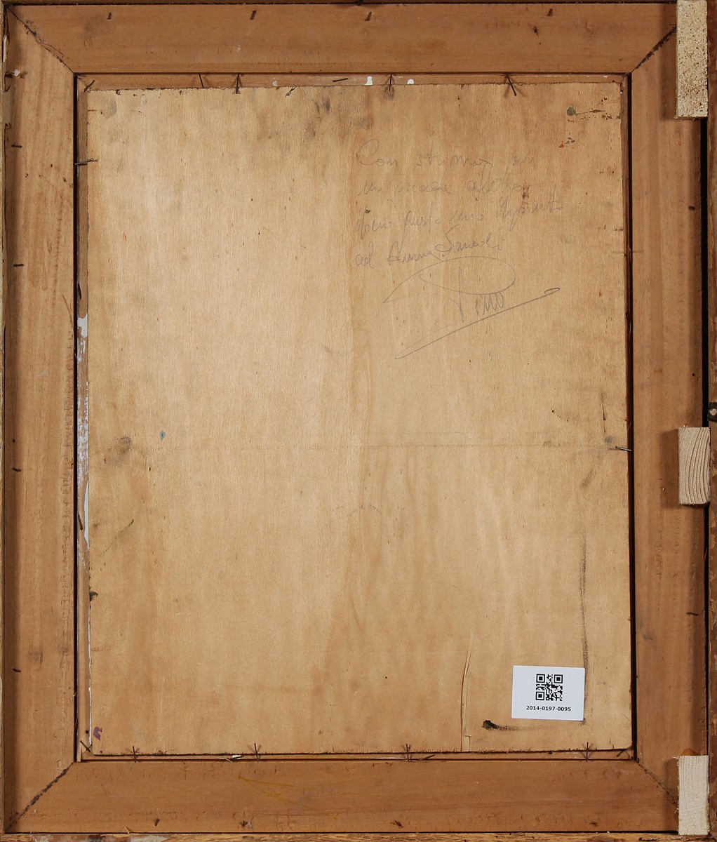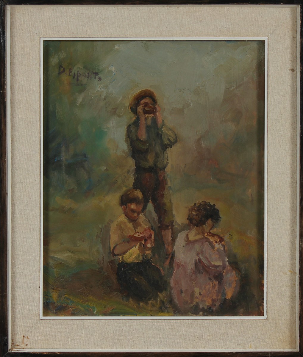 ANONIMO Tre soggetti in campagna. Olio su tavola. Cm 50,00 x 40,00. Firmata in alto a sinistra D. Esposito. Cornice presente
