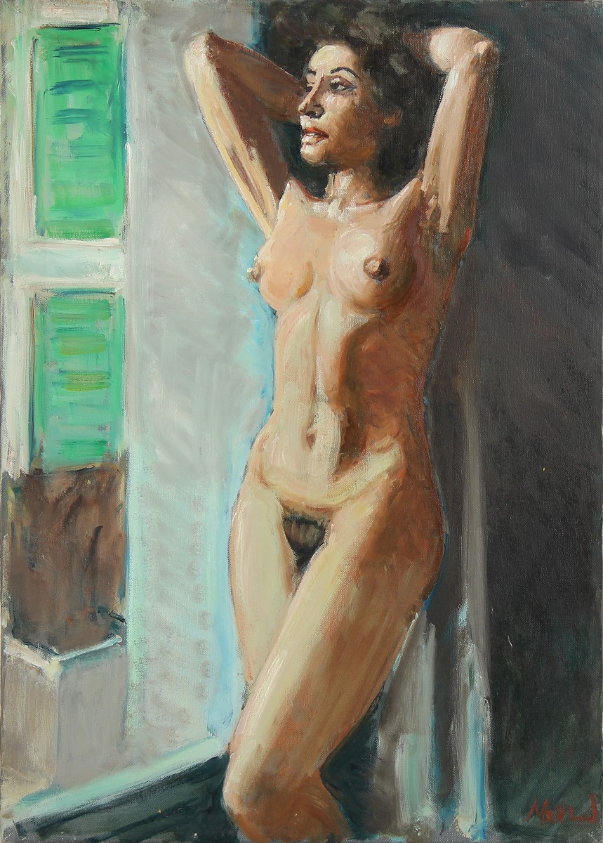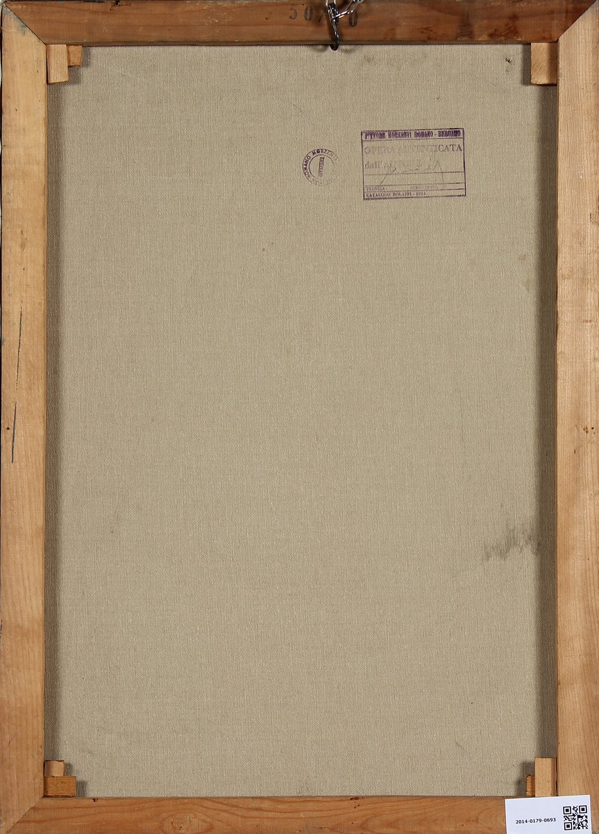 MORZENTI ROMANO Corpo di donna. Olio su tavola. Cm 50,00 x 70,00. Firma in basso a destra. Al retro cartiglio e firma per autenticità, timbro di Romano Morzenti.