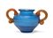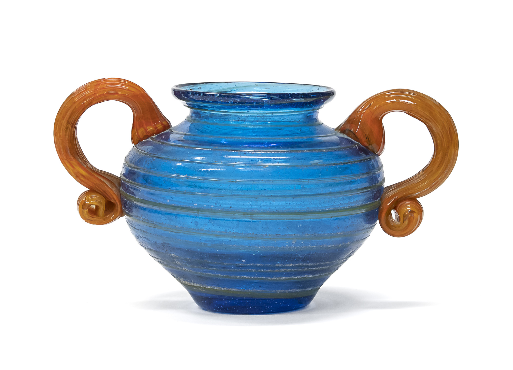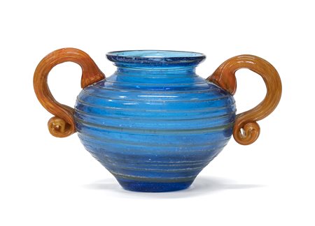 con corpo a fondo azzurro con sagoma globulare con anelli a rilievo al corpo. Manici in pasta di vetro a fondo arancio.