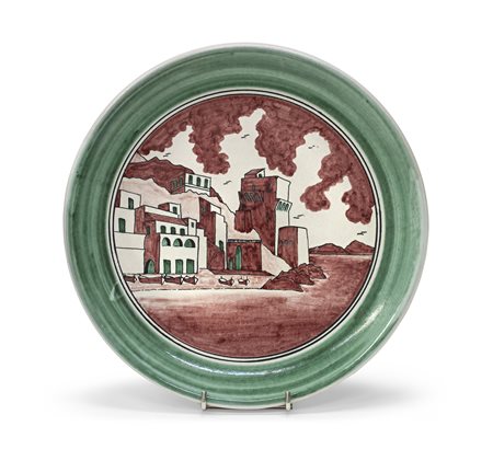 con decoro a veduta marina nelle tonalità del rosso. Bordo a smalto verde.
