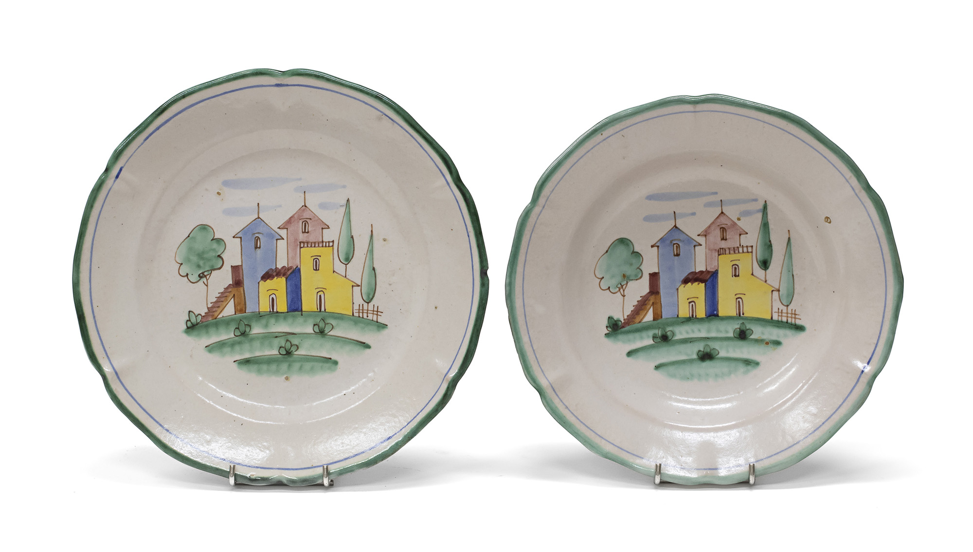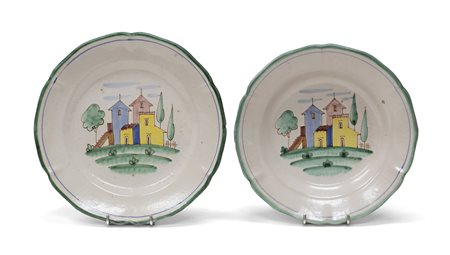 a smalti policromi su fondo crema, decorati a veduta di villaggio antico.
