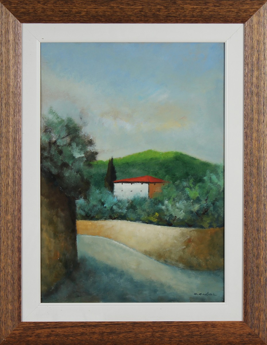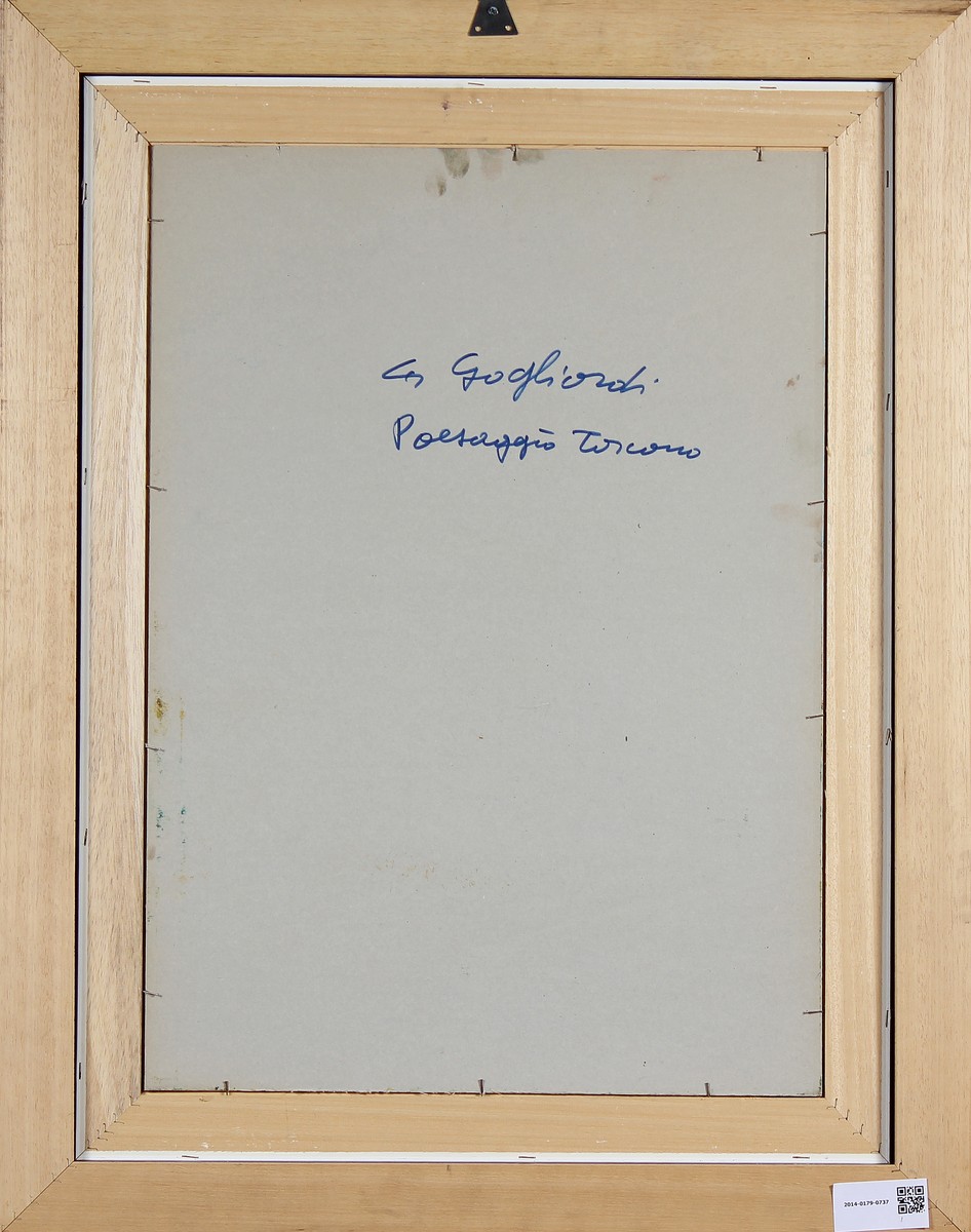 GAGLIARDI GIUSEPPE (n. 1896) Paesaggio toscano. Olio su cartone. Cm 50,00 x 70,00. Firma in basso a destra. Al retro titolo e firma. Cornice presente