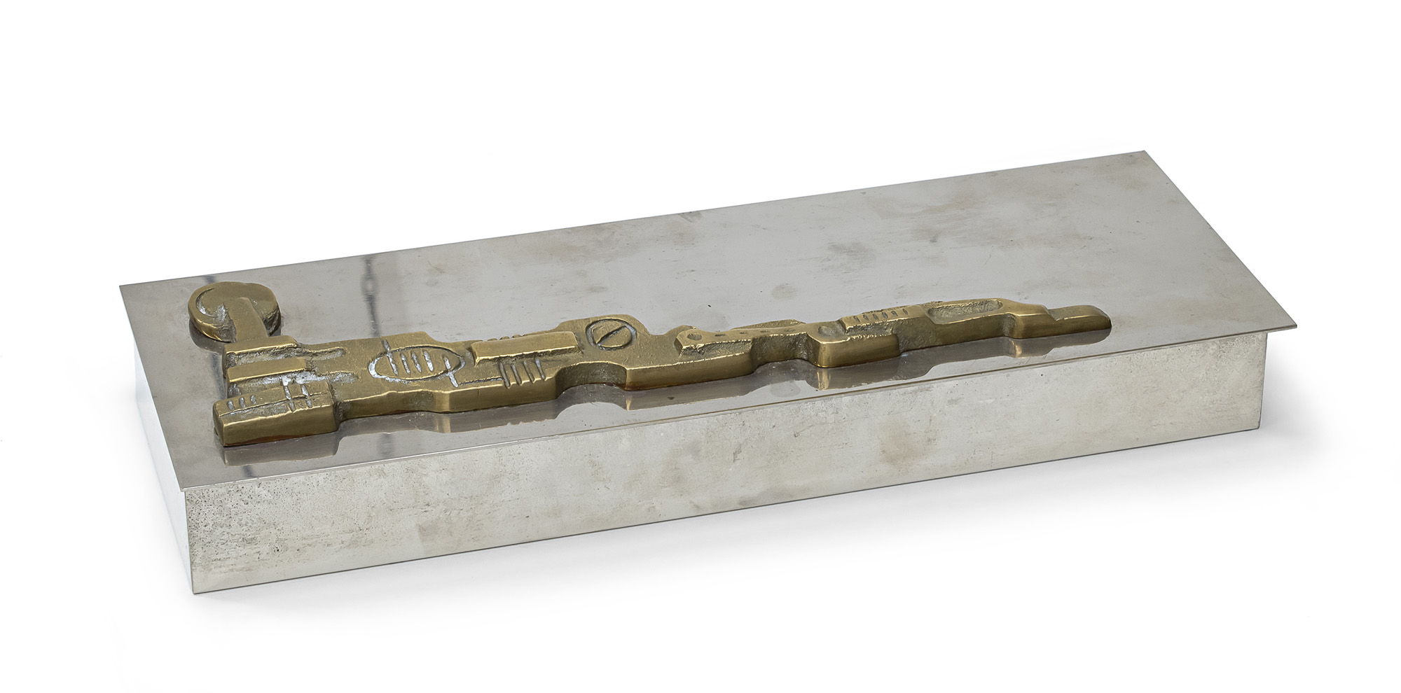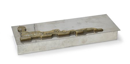 con coperchio decorato da bassorilievo in bronzo dorato di forma astratta. Finitura interna in vetro nero.