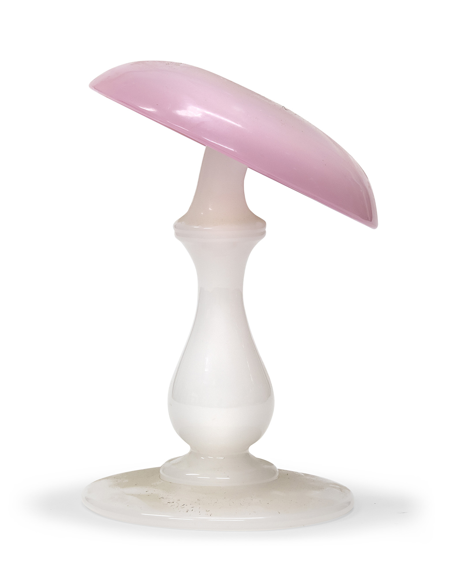 con cappello a fungo a fondo rosa e gamba a balaustro a fondo bianco-latte.