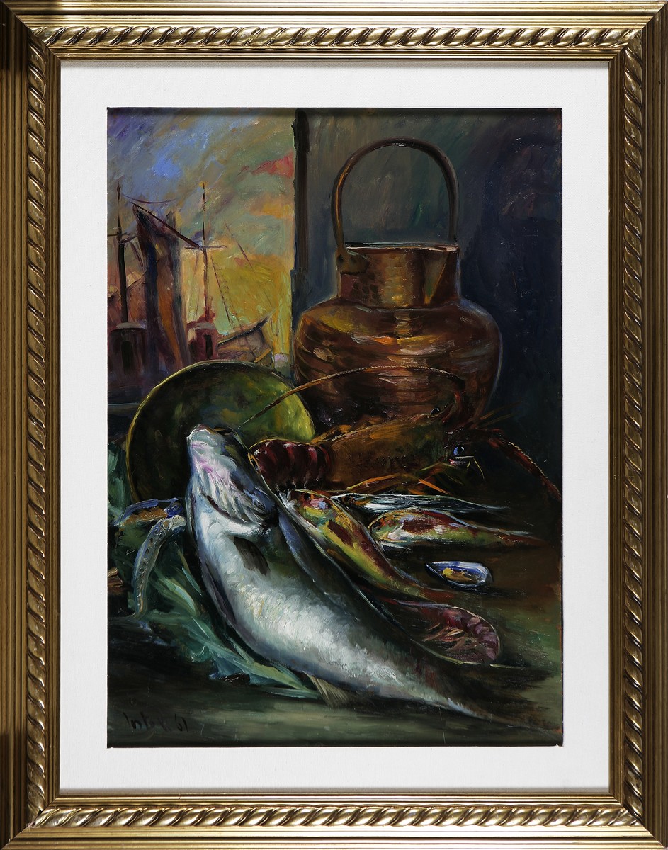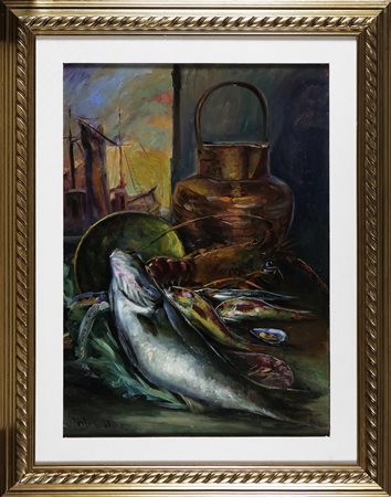 TORTOLI ENNIO (n. 1928) Natura morta. Olio su faesite. Cm 50,00 x 70,00. Firma in basso a sinistra. Autentica su fotografia a cura di F. Rigacci articoli per belle arti, Firenze. Cornice presente