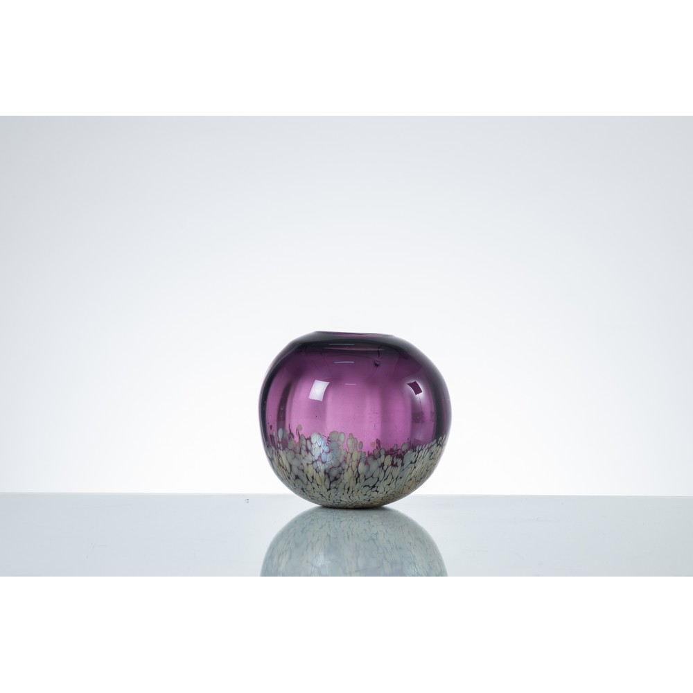 Vaso in vetro ametista, corpo globulare decorato nella parte inferiore con murrine silver, bocca circolare piana.