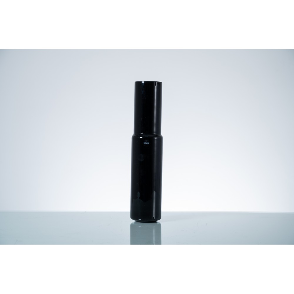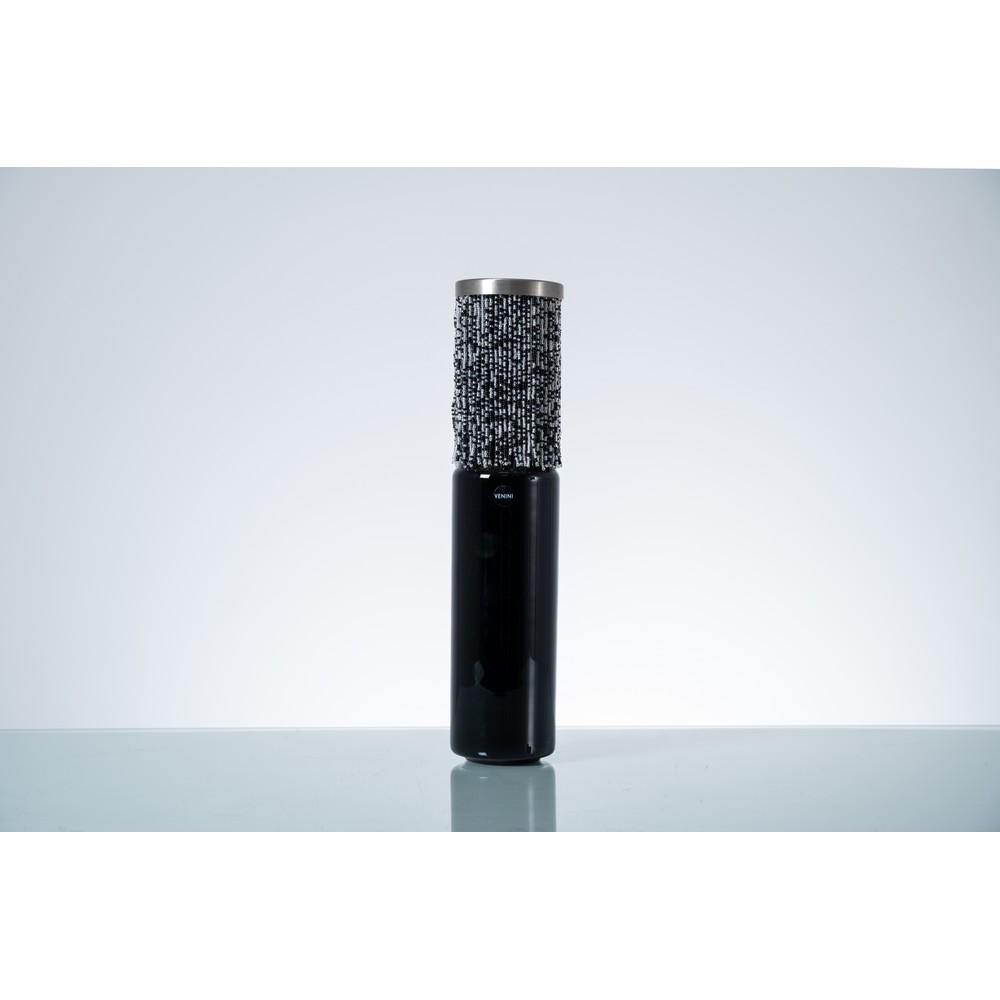 Vaso modello “Contessa” in vetro opalino lattimo nero, corpo cilindrico con bocca piana circolare, perle in cristallo nero, metallo nickel. Firma a punta Venini, 2006, etichetta.