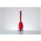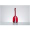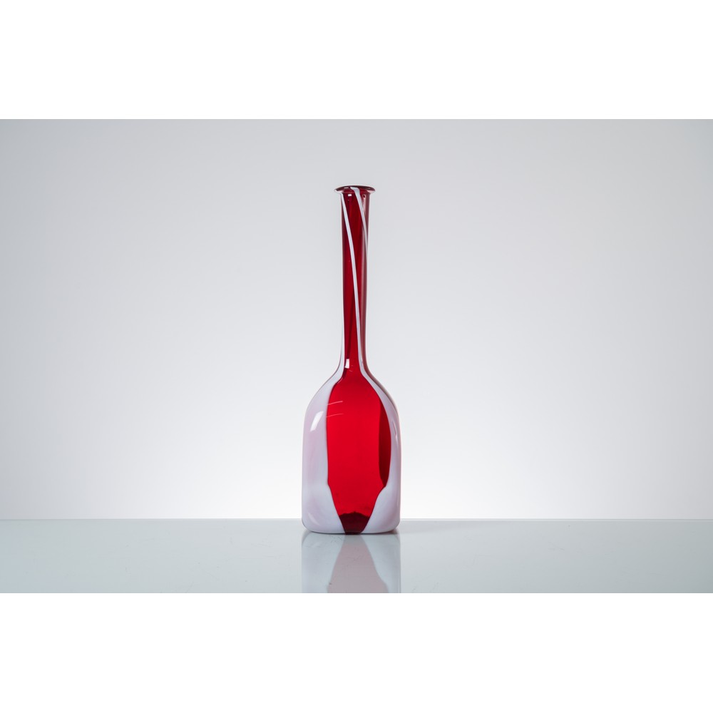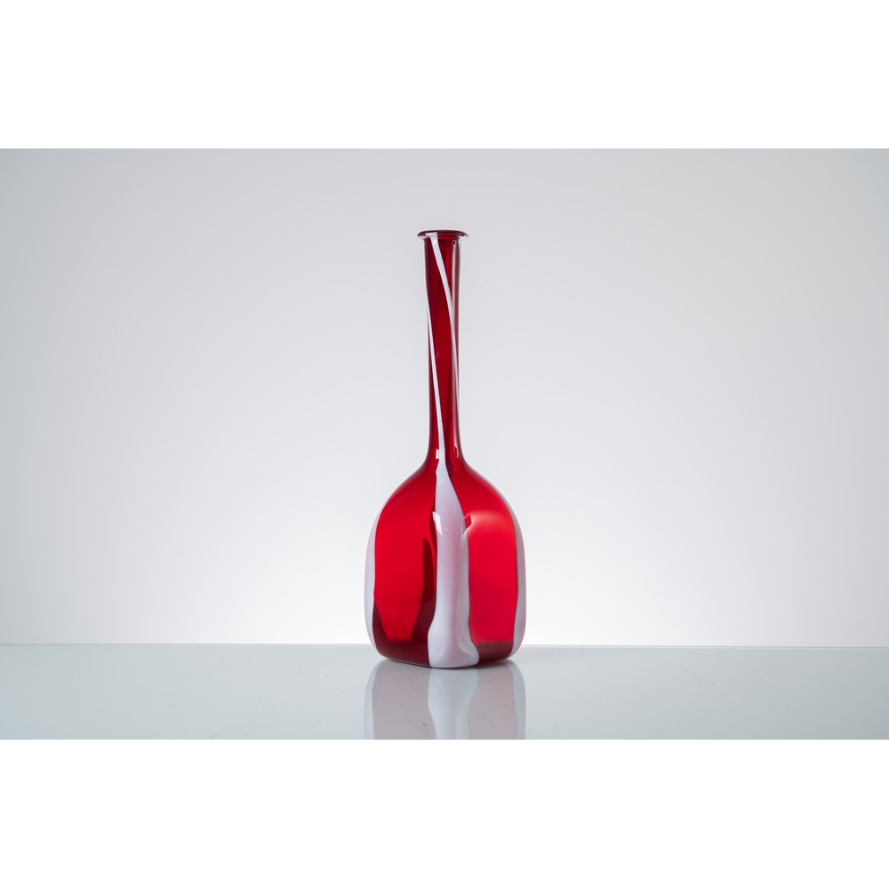 Bottiglia in vetro soffiato rosso e decorata con rigature e macchie lattime, corpo cubico con lungo collo cilindrico, bocca piana circolare estroflessa .