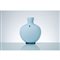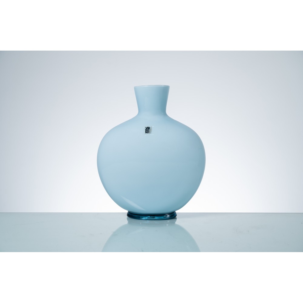 Vaso in vetro opalino celeste (disegno del 1933), corpo sferico schiacciato, collo a tromba, bocca piana circolare, base in vetro trasparente azzurrino. Firma all’acido "Venini Italia 1979", etichetta di produzione.