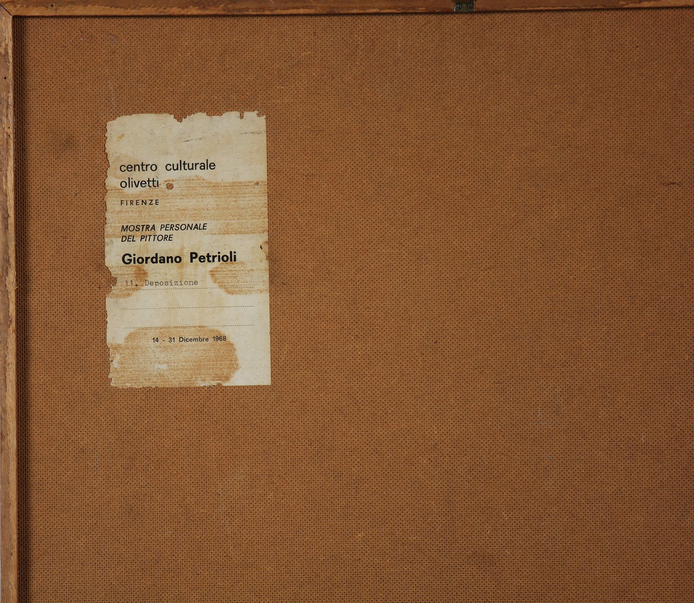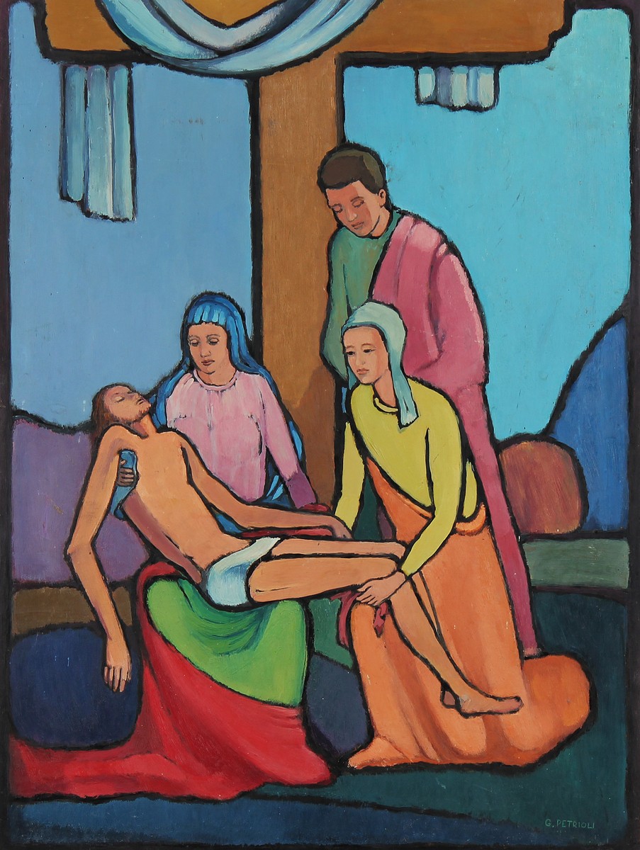 PETRIOLI GIORDANO Desposizione dalla croce. Olio su faesite. Cm 48,00 x 65,00 x 1,00. Firma in basso a destra. Al retro Etichetta del centro Culturale Olivetti, Firenze, mostra personale del pittore dal 14 al 31 dicembre 1968.