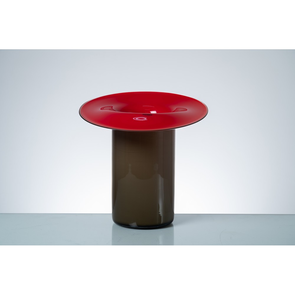 Vaso in vetro incamiciato talpa e rosso, corpo cilindrico con bocca circolare piana e parzialmente piegata. Etichetta di produzione e firma "Barbini Murano". Lievissimo difetto alla bocca.