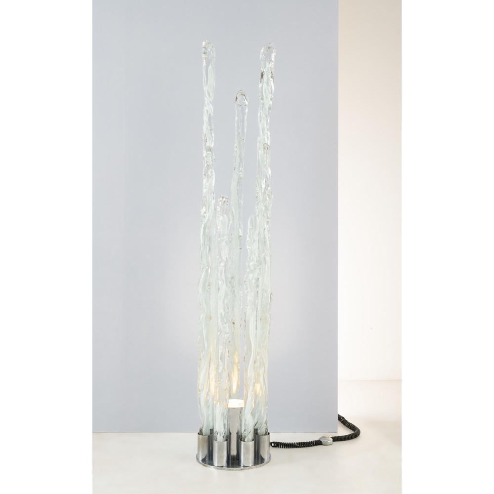 Lampada da terra ad una luce modello “E7T Excalibur”, struttura in acciaio cromato con elementi verticali in vetro cristallo iridescente con inclusione di fasce in vetro lattimo.