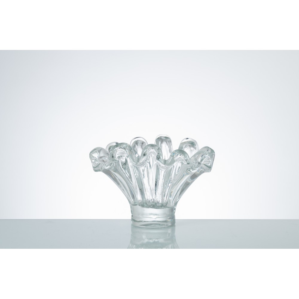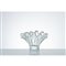 Vaso della serie “A Grosse Costolature” in vetro incolore soffiato pesante, corpo a ventaglio con grosso bordo ondulato, base circolare.