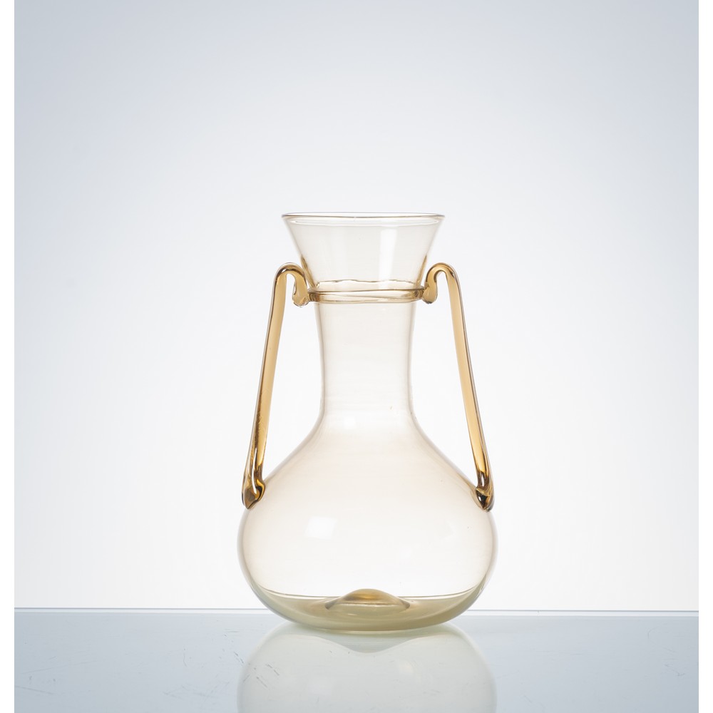 Vaso modello “1878” in vetro pagliesco, corpo sferico con collo a tromba, bocca circolare piana, anse applicate. Firma all’acido “Venini Murano Italia”.