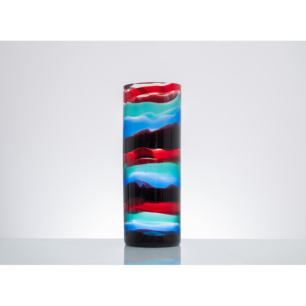 Raro e unico vaso a “Fasce Orizzontali” in vetro soffiato e vetro applicato con fasce rosse, verdi, blu zaffiro e toni di sovrapposizione, corpo cilindrico con bocca piana circolare. Timbro all’acido per la produzione 1955-59 “Venini Murano Italia”.