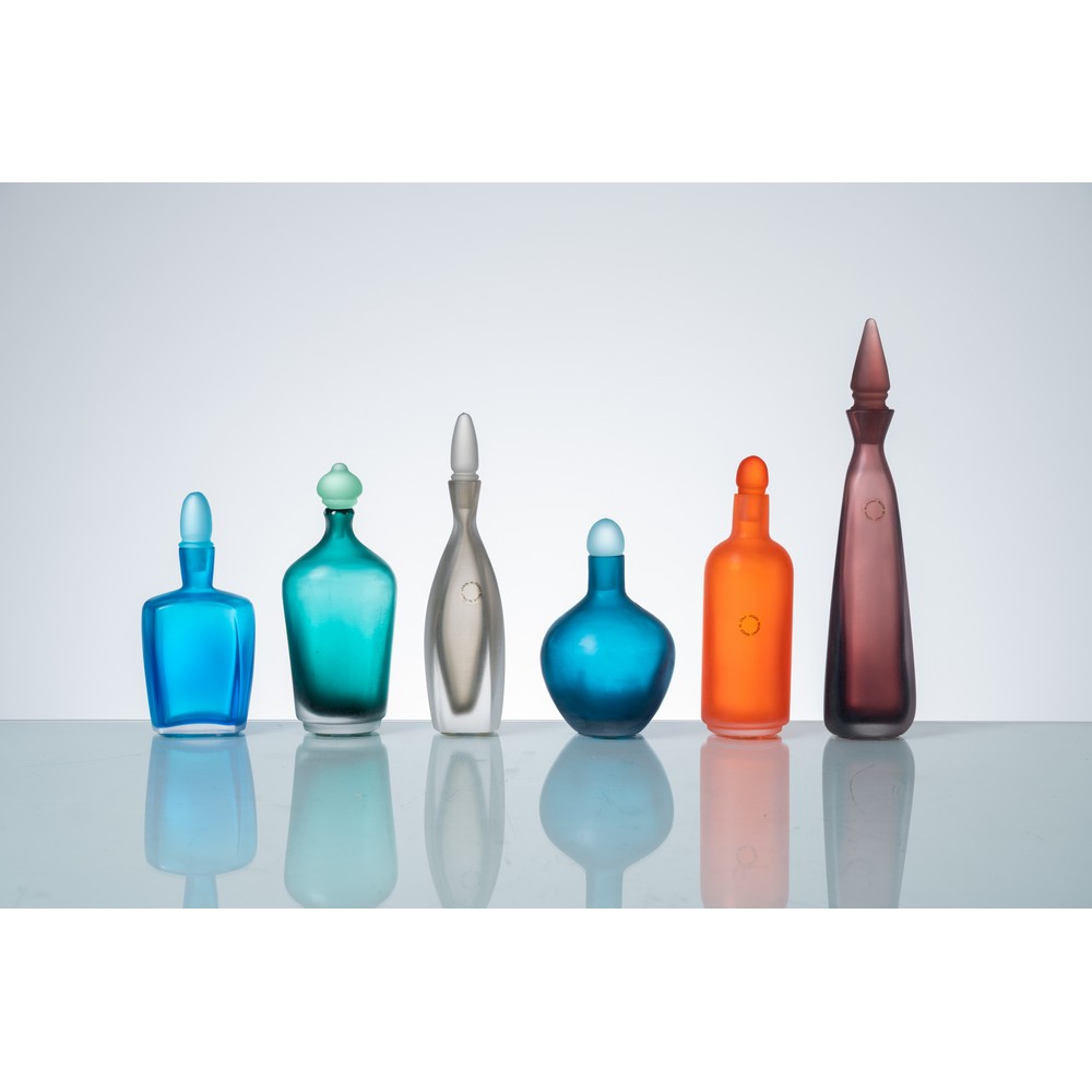 Sei bottiglie con tappo della serie "Incisi" in vetro pesante rifinito da leggere incisioni orizzontali su tutta la superficie, di forma e colore differente, uno grigio ferro, lilla, arancione bruciato, blu oceano, blu, verde erba. Etichette e firmate a punta sotto la base "Venini Italia" 1997, 1994(Arancione).