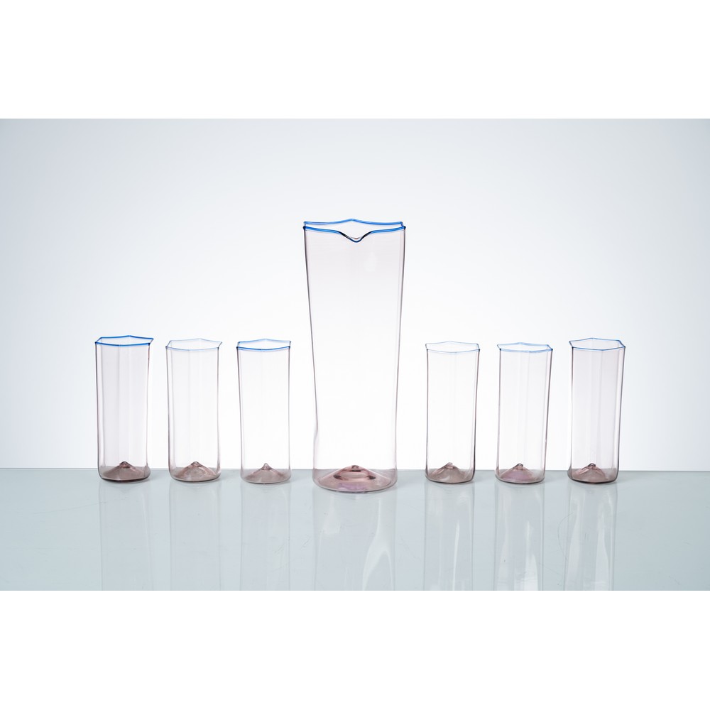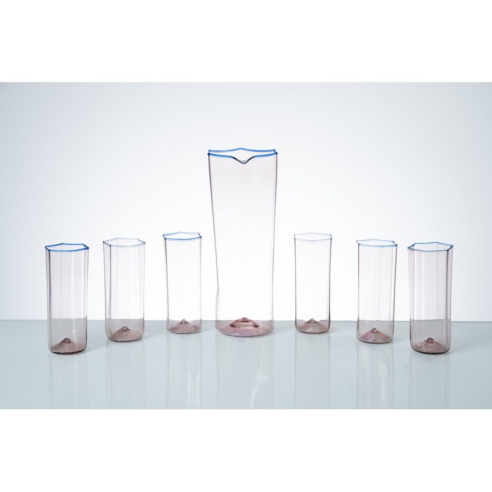 Una caraffa e sei bicchieri modello “Esagonale” in vetro soffiato rosato e azzurrino, profilo superiore con decoro applicato a caldo.