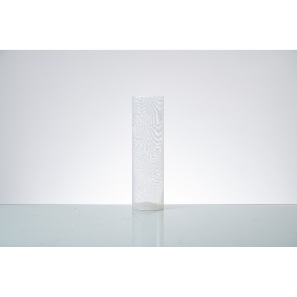 Vaso in vetro soffiato incolore decorato a “mezza filigrana” lattimo, corpo cilindrico con bocca circolare piana. Firma a graffio sotto la base "Venini Italia”.