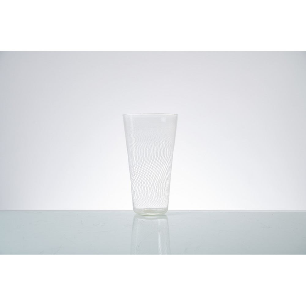 Vaso modello "3605" in vetro soffiato incolore decorato a “mezza filigrana” lattimo, corpo conico con bocca circolare piana. Etichetta di produzione bianca “Venini Murano, Made in Italy”.