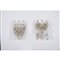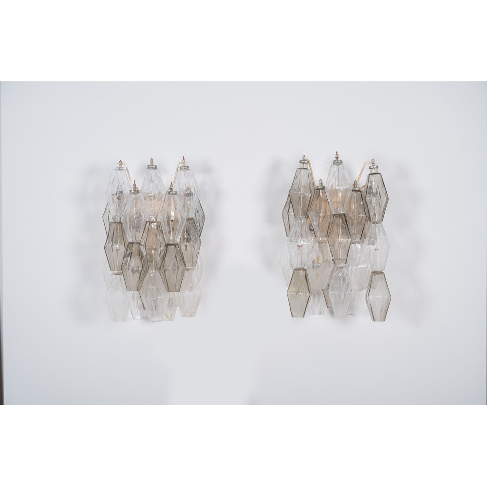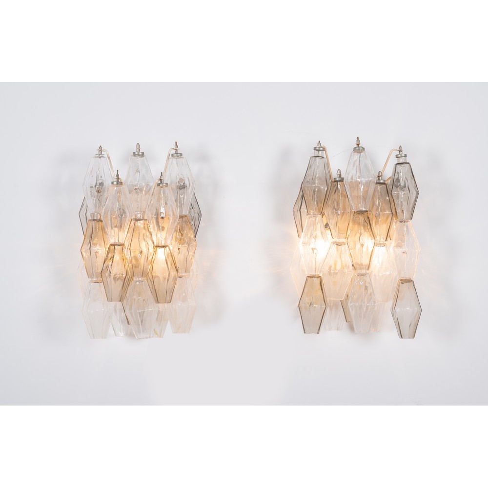 Coppia di lampade a parete a due luci della serie “Poliedri”, struttura in metallo cromato con diffusore composto da elementi Poliedri, realizzati in vetro soffiato cristallo trasparente e fumè disposti su più livelli. Firma incussa Venini.