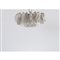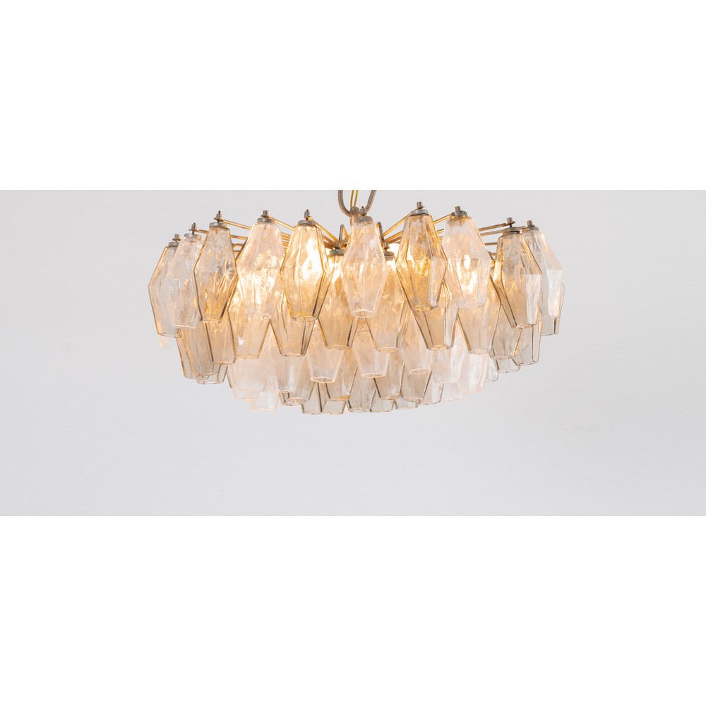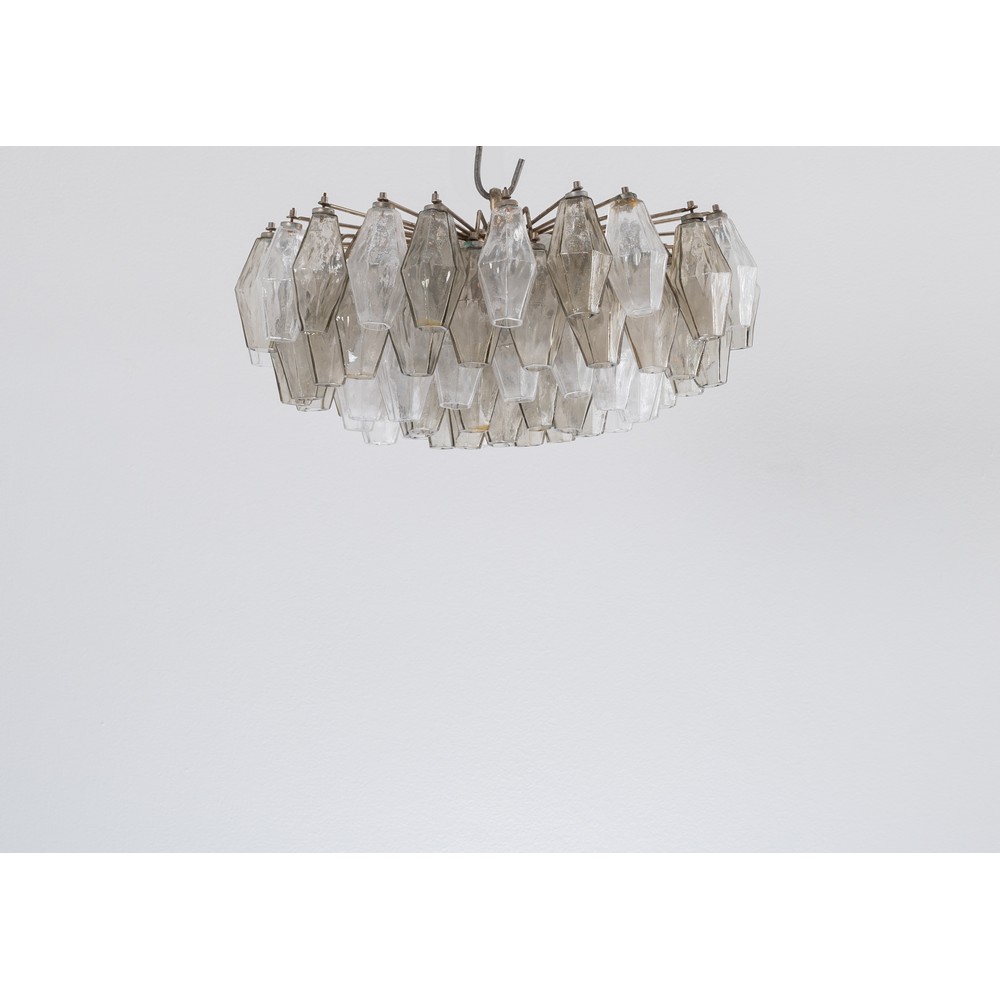 Lampada a sospensione a nove luci della serie “Poliedri”, struttura in metallo cromato con diffusore composto da elementi Poliedri, realizzati in vetro soffiato cristallo trasparente e fumè disposti su più livelli. Firma incussa Venini.