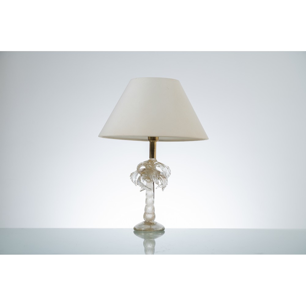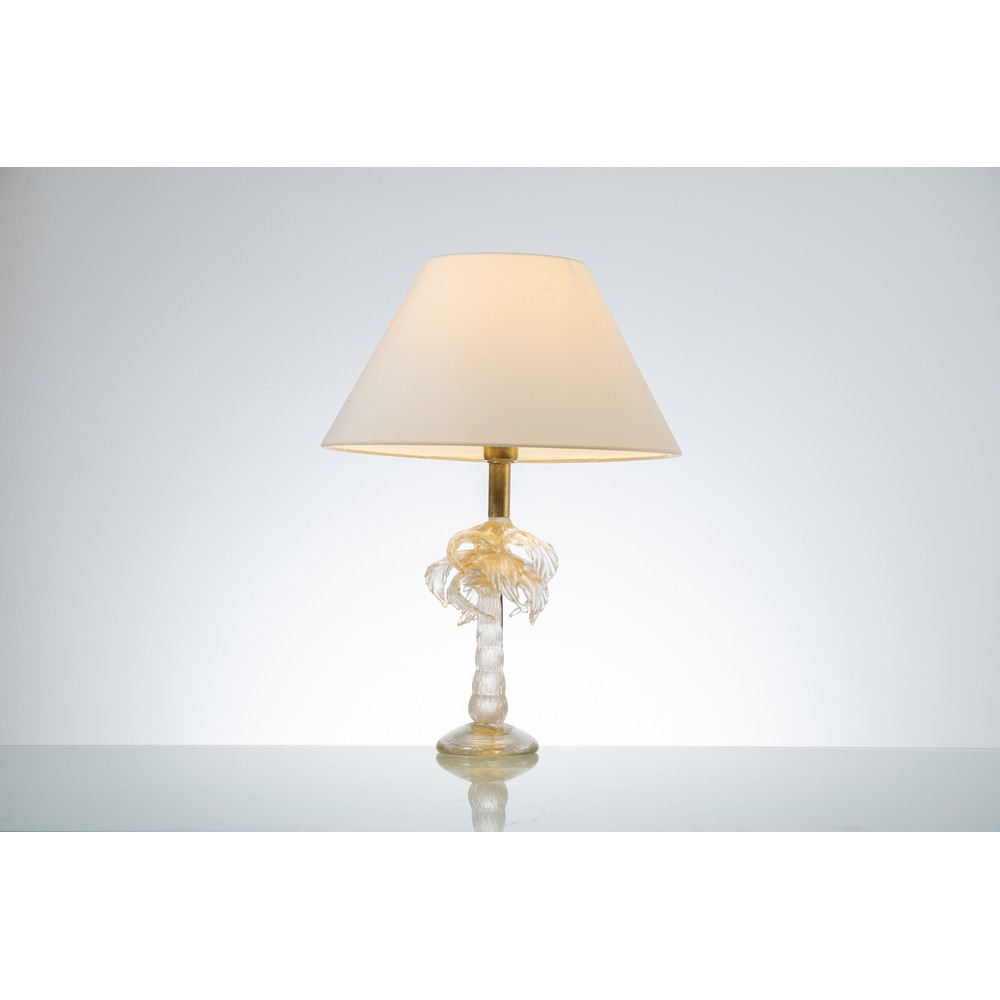 Lampada da tavolo “Palm Tree” in vetro di Murano incolore e oro, metallo dorato, diffusore in tessuto avorio.