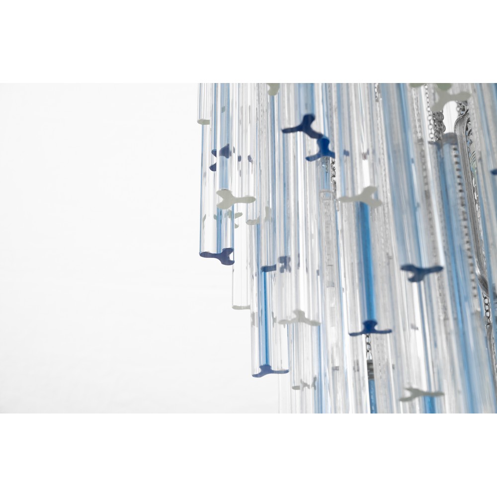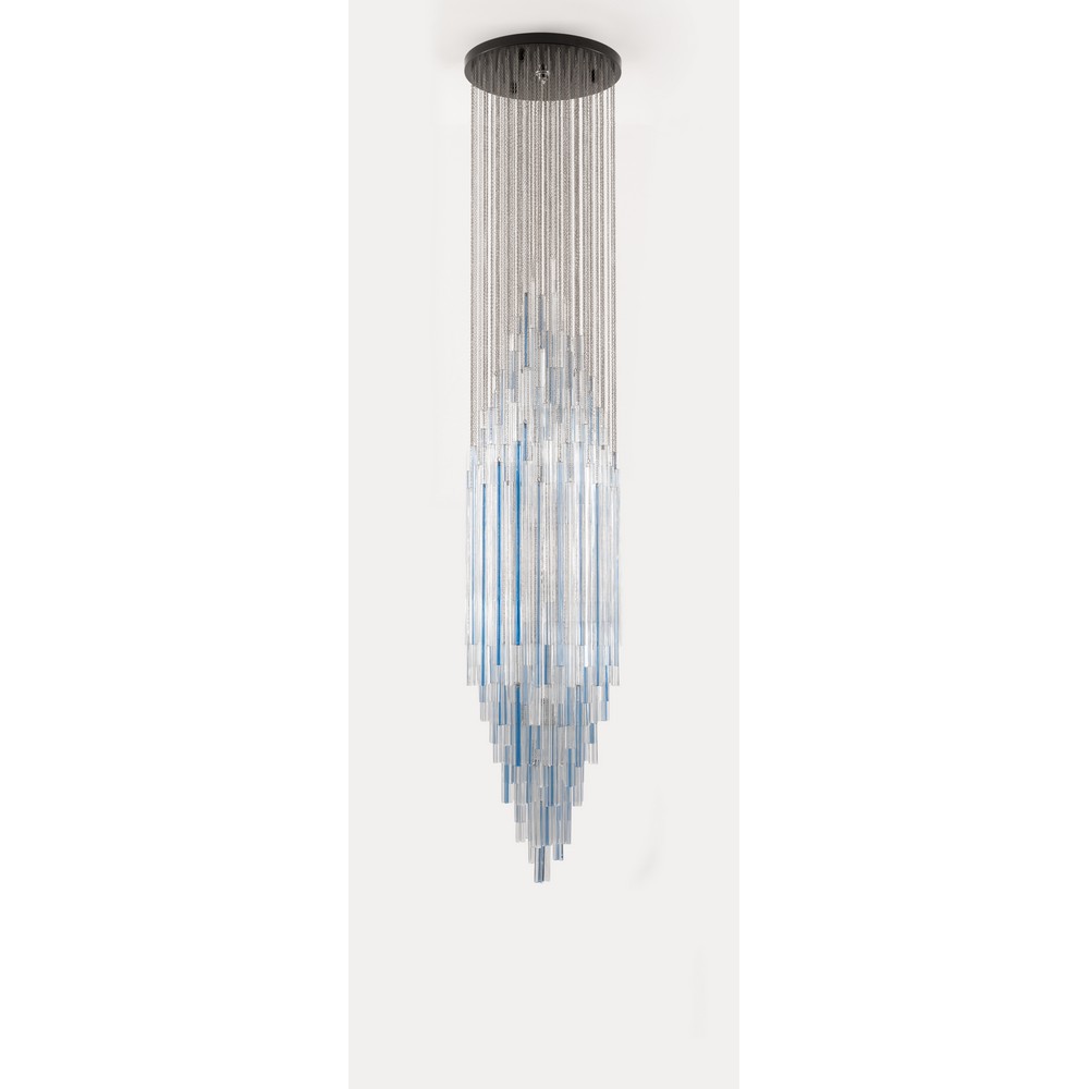 Grande lampada a sospensione a sei luci, struttura in metallo verniciato, diffusore composto da elementi modulari della serie “Triedi” in cristallo incolore e azzurrino sospesi con catenelle.