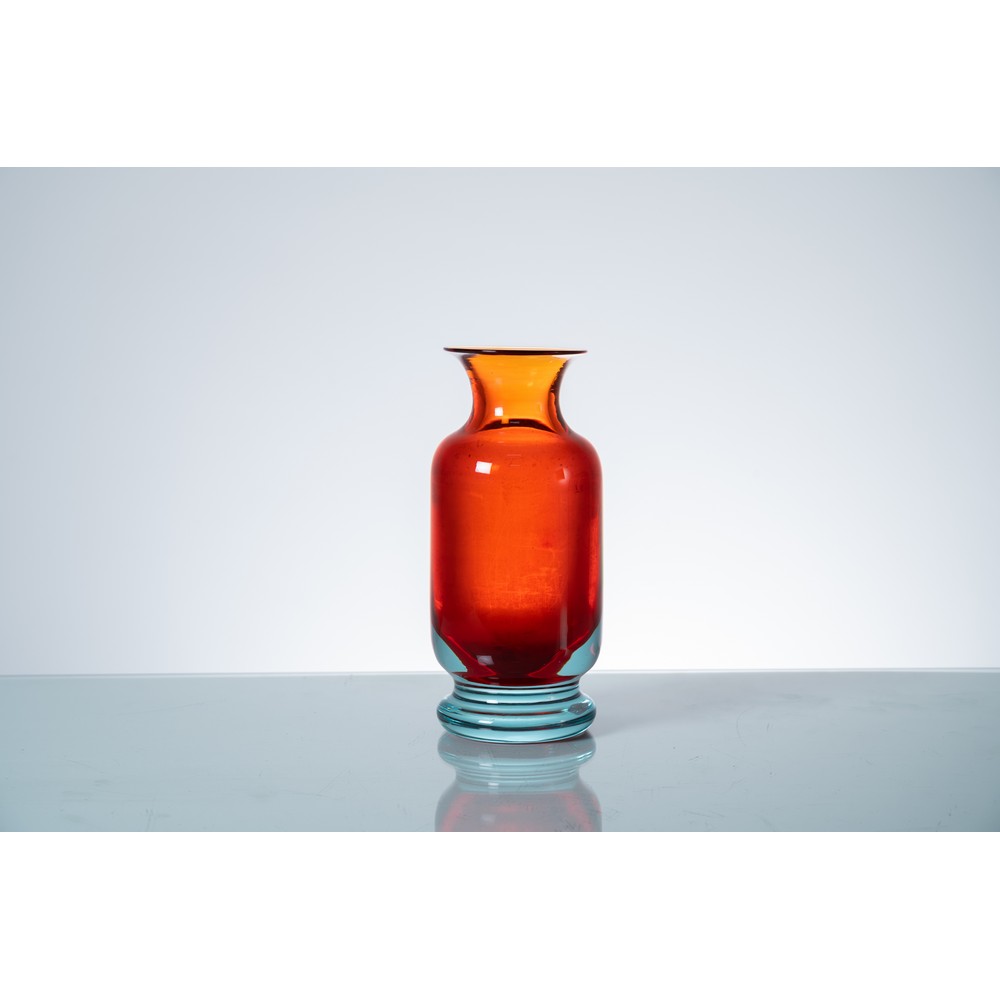 Vaso in vetro sommerso azzurrino, rosso ed arancione, corpo cilindrico con collo a svasare e bocca piana circolare.