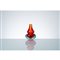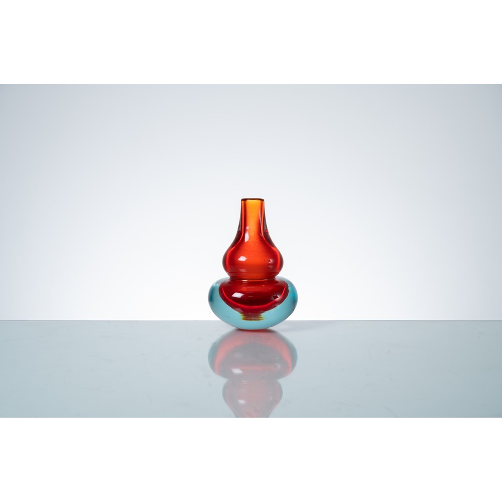 Vaso in vetro sommerso azzurrino, rosso ed arancione, corpo strozzato composto da una parte semisferica e una parte a goccia, lungo collo e bocca piana circolare.