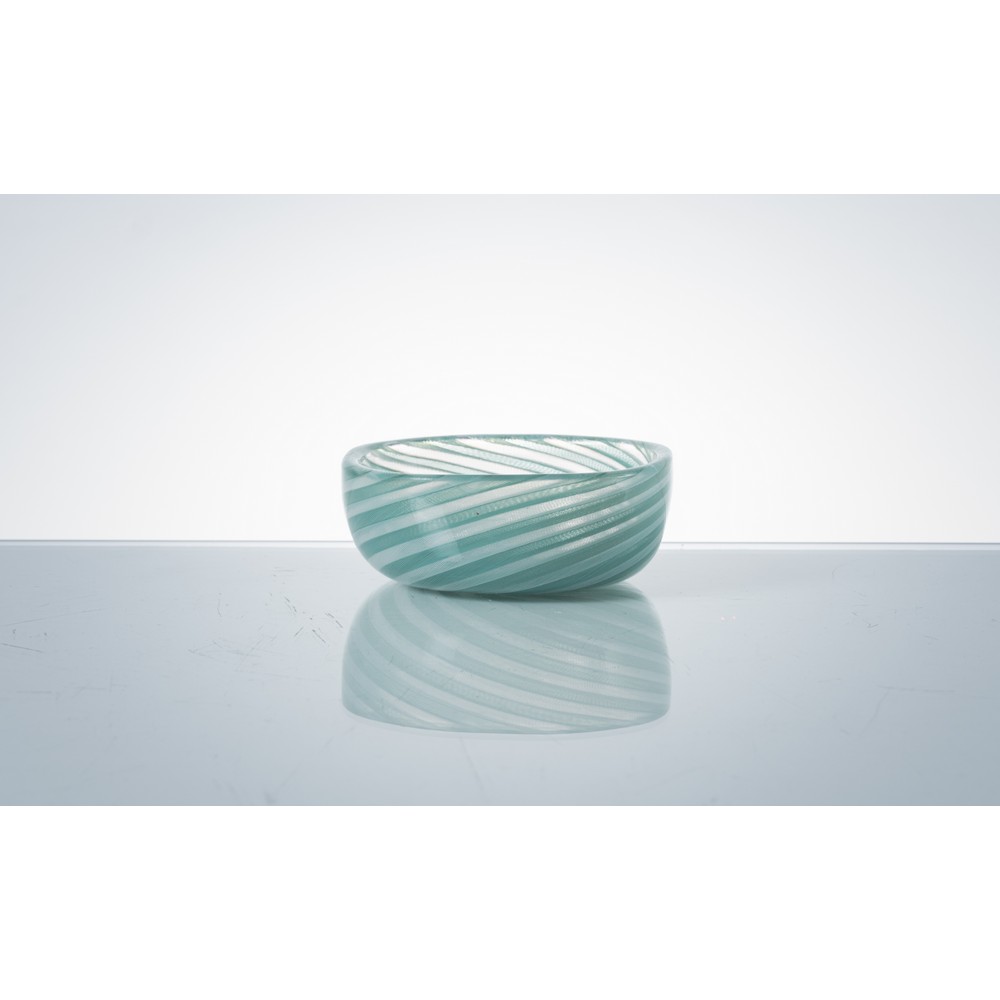 Coppa in vetro soffiato zanfirico a canne diagonali a rete lattimo e verde, corpo semisferico schiacciato con bocca quadrangolare piana. Firma all'acido sotto la base "Venini Murano”.