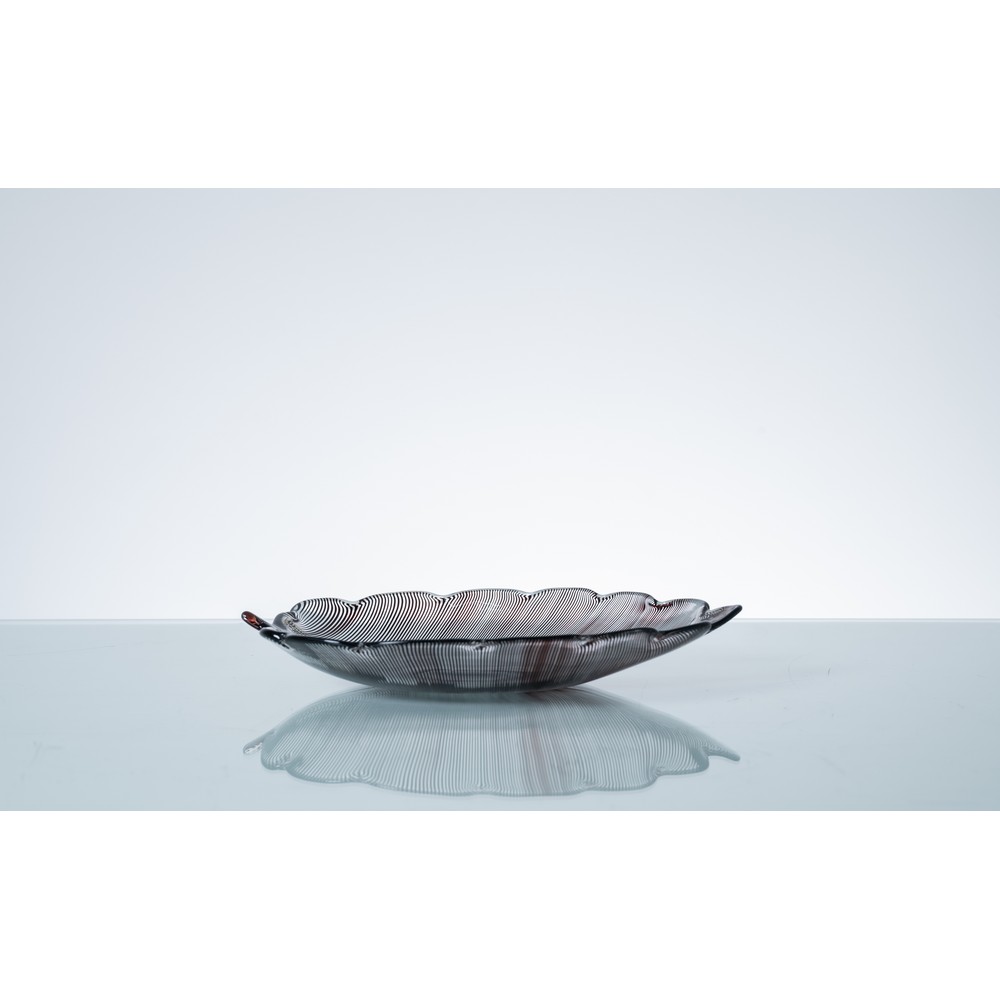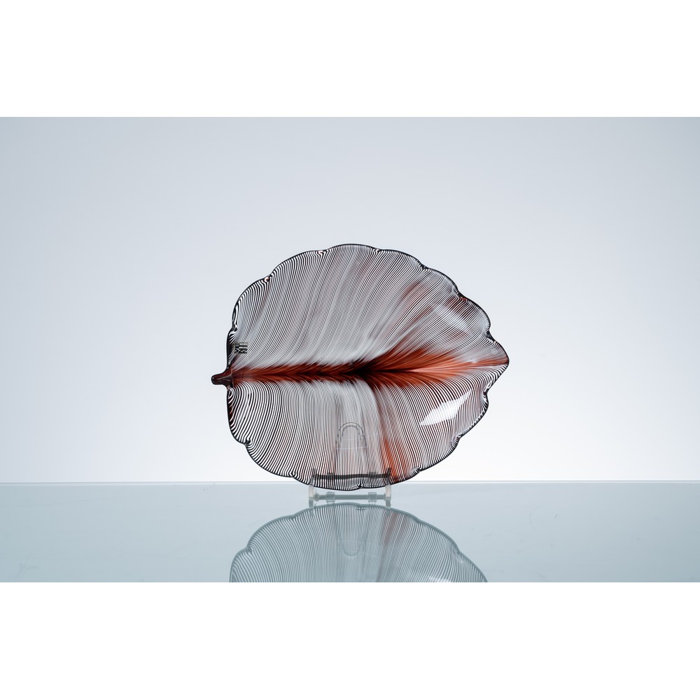 Una foglia in vetro incolore a mezza filigrana ametista. Etichetta e firma e data a punta “Venini 1979”.