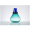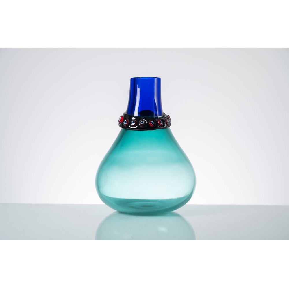 Vaso in vetro soffiato a incalmo verde e blu, sul collo decoro in vetro nero e piccole murrine policrome applicate a caldo, corpo a goccia con collo cilindrico e bocca circolare piana. Firma all’acido Barbini Murano.