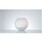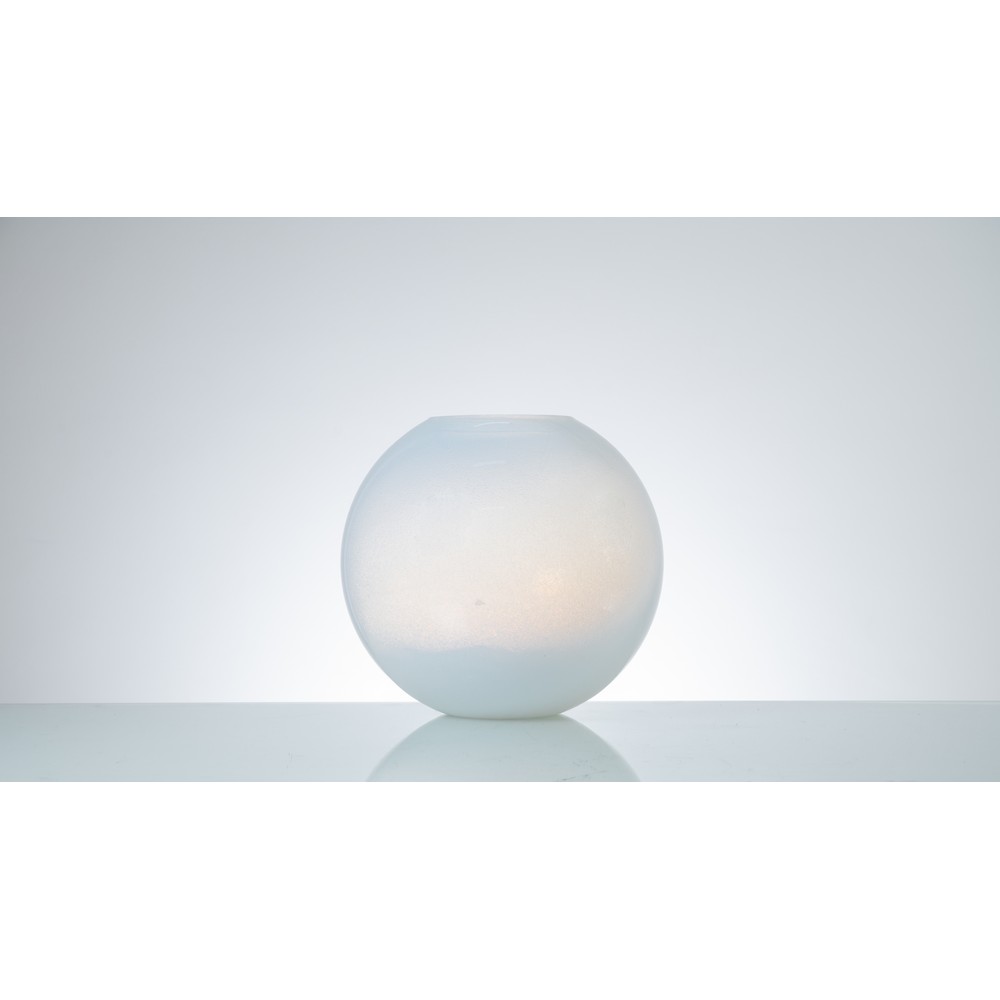 Vaso in vetro soffiato lattimo, corpo sferico con bocca circolare piana.