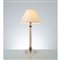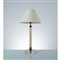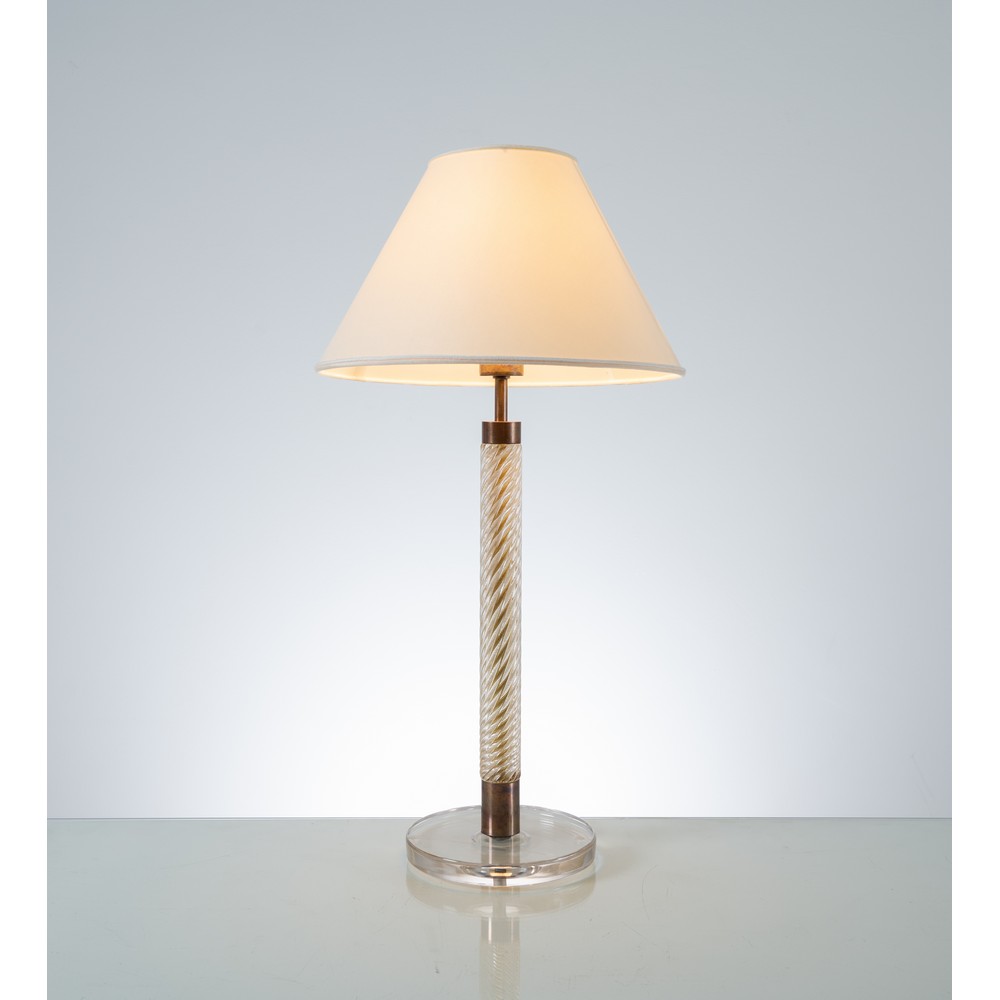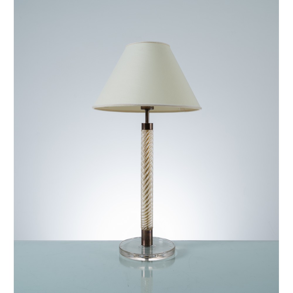 Lampada da tavolo ad una luce struttura in ottone con fusto in vetro incolore trasparente a torchon, ottone lucido, base circolare in vetro, diffusore in tessuto avorio. Firma a graffio Salviati.