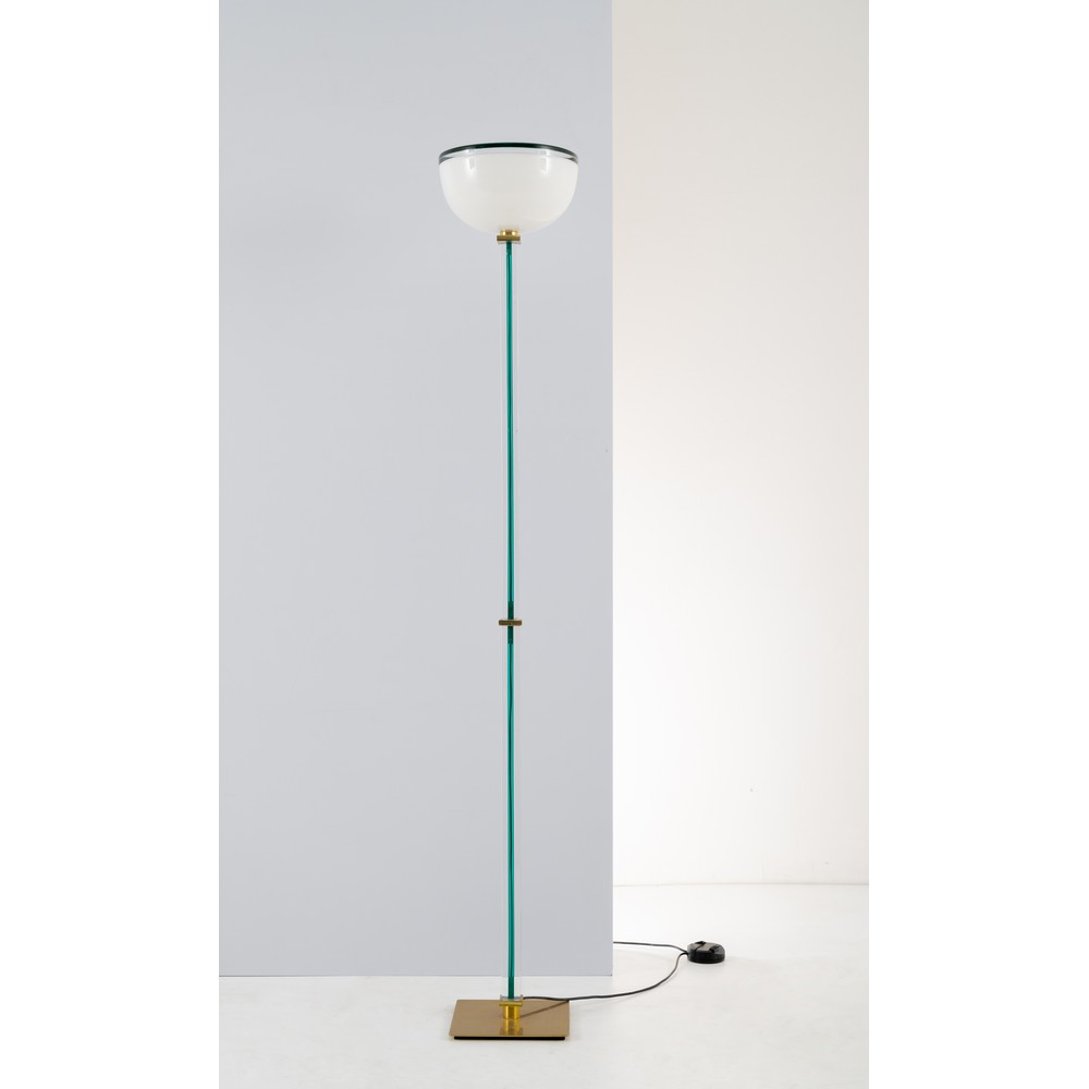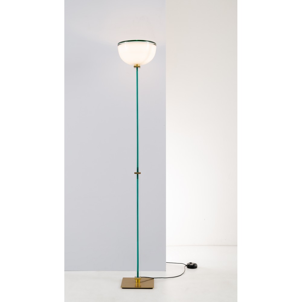 Lampada da terra modello "Tolboi" ad una luce, diffusore semisferico in vetro soffiato a incalmo lattimo, cristallo trasparente e verde. Asta di sostegno in vetro sommerso trasparente cristallo e verde. Giunti e base quadrata in ottone lucidati. Firmata e datata a punta.