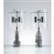 Coppia di lampade da tavolo a quattro luci, struttura in metallo cromato, fusto composto da lamelle di metallo rettangolari sovrapposte, diffusori cilindrici con paralume in plexiglass trasparente .