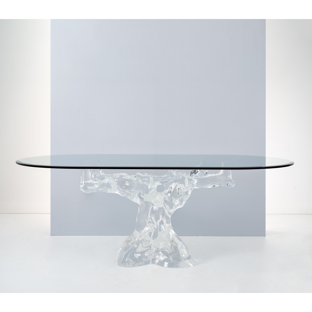 Tavolo da pranzo con piede scultura ramificata in lucite, piano ovale in cristallo di grosso spessore bisellato. Opera realizzata in edizione limitata di 300 pezzi.