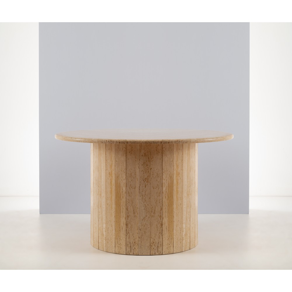 Tavolo da pranzo “Ashby” in marmo travertino, piede a scanalature, piano circolare.