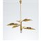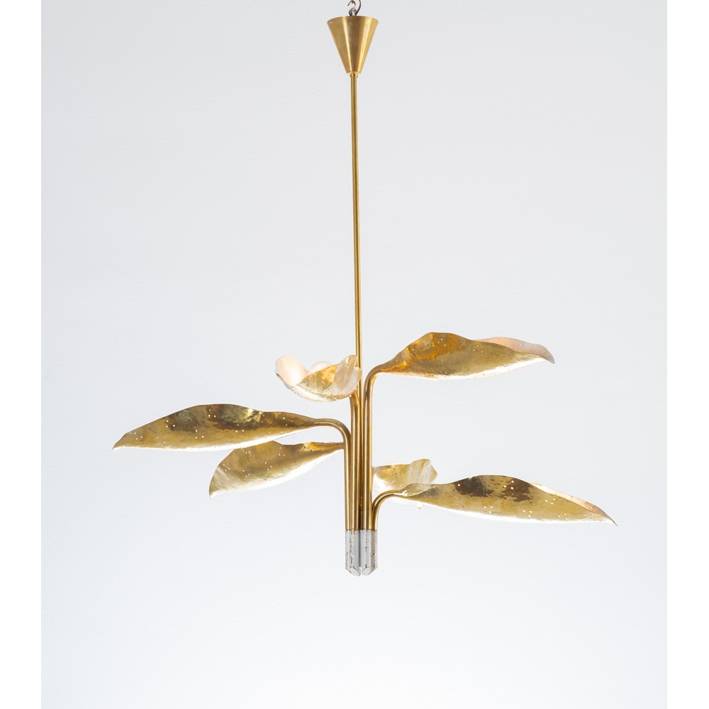 Lampada a sospensione a sei luci modello “12369”, struttura in ottone con diffusori a foglie martellate e microforate, bracci orientabili.